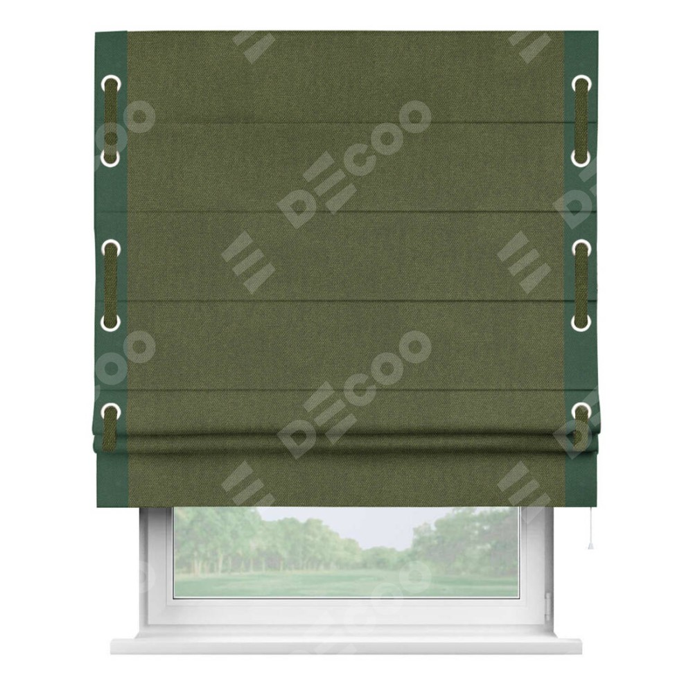 Римская штора производителя «Cortin», используется для проёма, пошита из ткани лён димаут салатовый, артикул 91002. Отделка шторы кантом «Стрим Дуо» на кантах расположены люверсы с пояском, ткань для канта используется лён димаут разной расцветки на выбор. Ткань для пояска обычно используется из основной ткани шторы, а так же можно сделать из любой расцветки по желанию. Имеет универсальный механизм и подходит для монтажа: на потолок, на стену и в нишу.