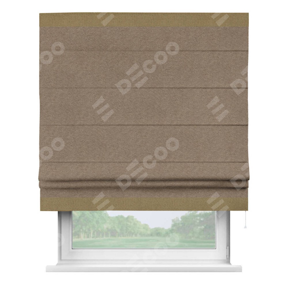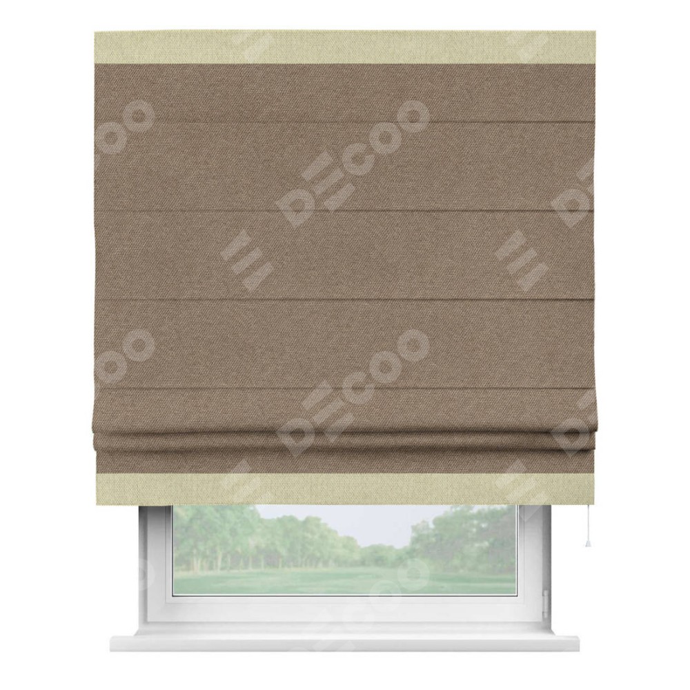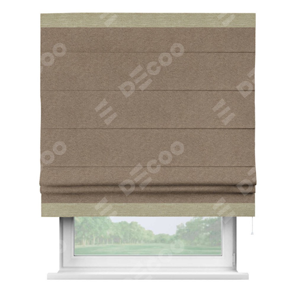 Римская штора производителя «Cortin», используется для проёма, пошита из ткани лён димаут коричневый, артикул 90996. Отделка шторы кантом «Горизонт», ткань для канта используется из льна димаут разной расцветки на выбор. Имеет универсальный механизм и подходит для монтажа: на потолок, на стену и в нишу.