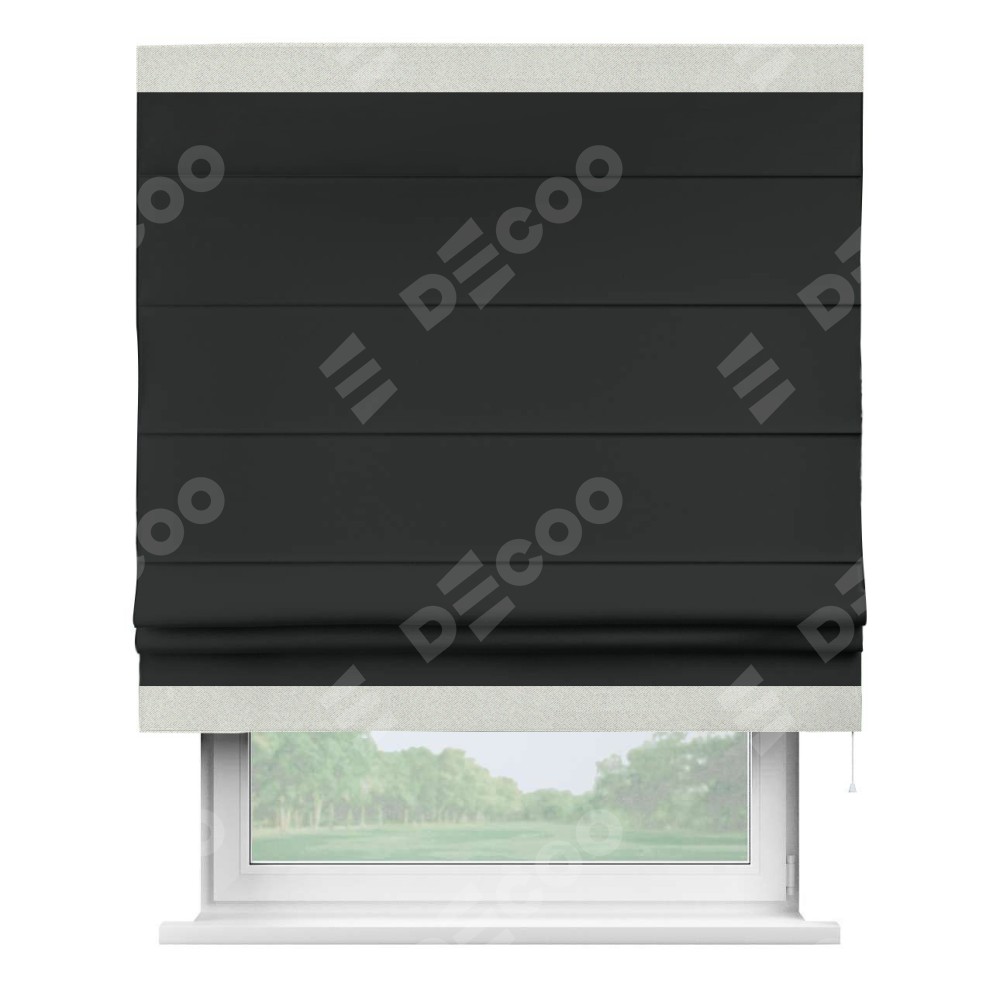 Римская штора производителя «Cortin», используется для проёма, пошита из ткани блэкаут однотонный черный, артикул ткани 91571−2. Отделка шторы кантом «Горизонт», ткань для канта используется из блэкаута однотонного разной расцветки на выбор. Имеет универсальный механизм и подходит для монтажа: на потолок, на стену и в нишу.