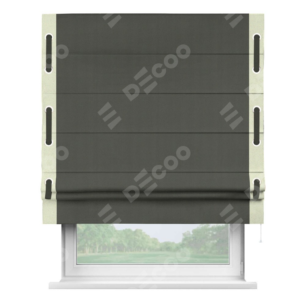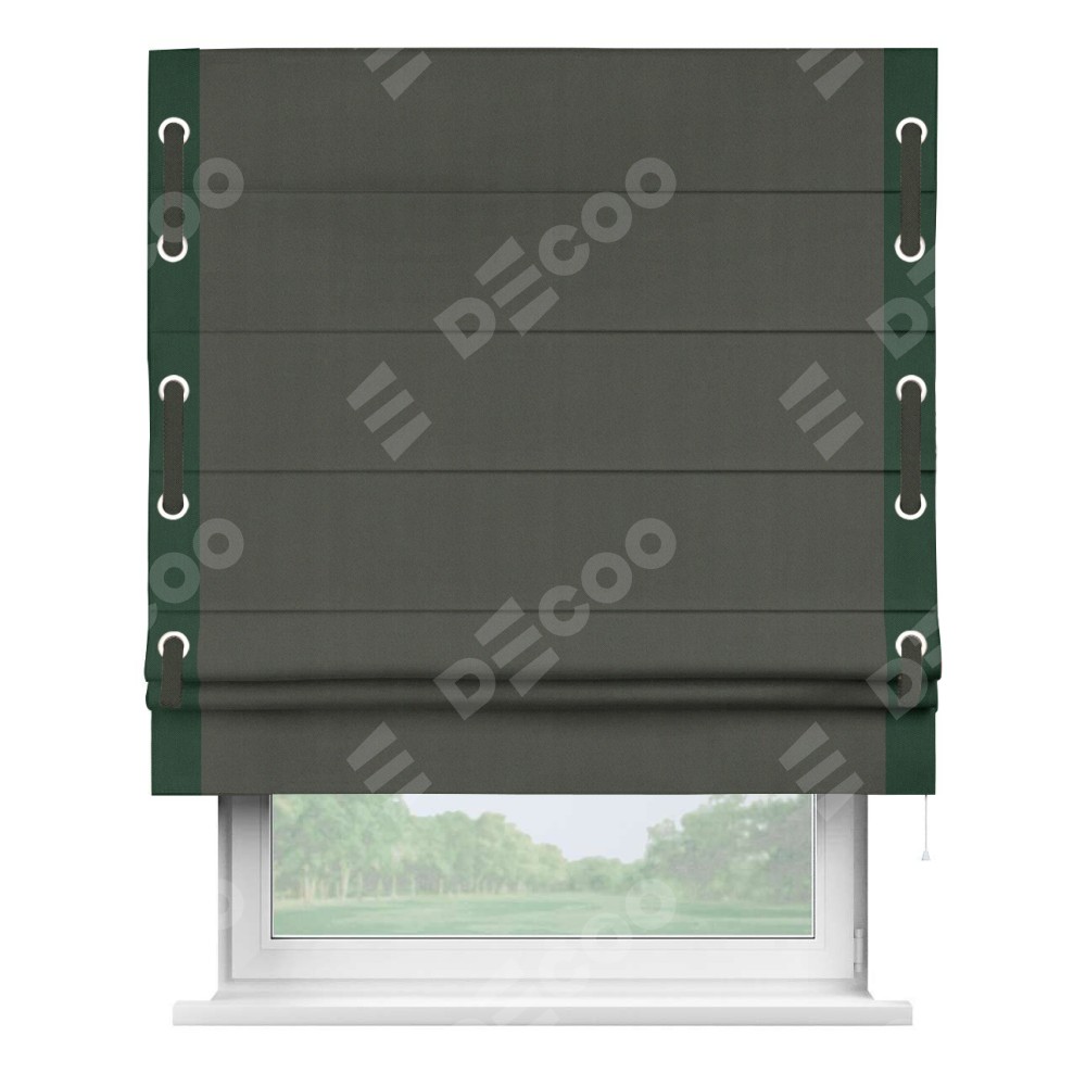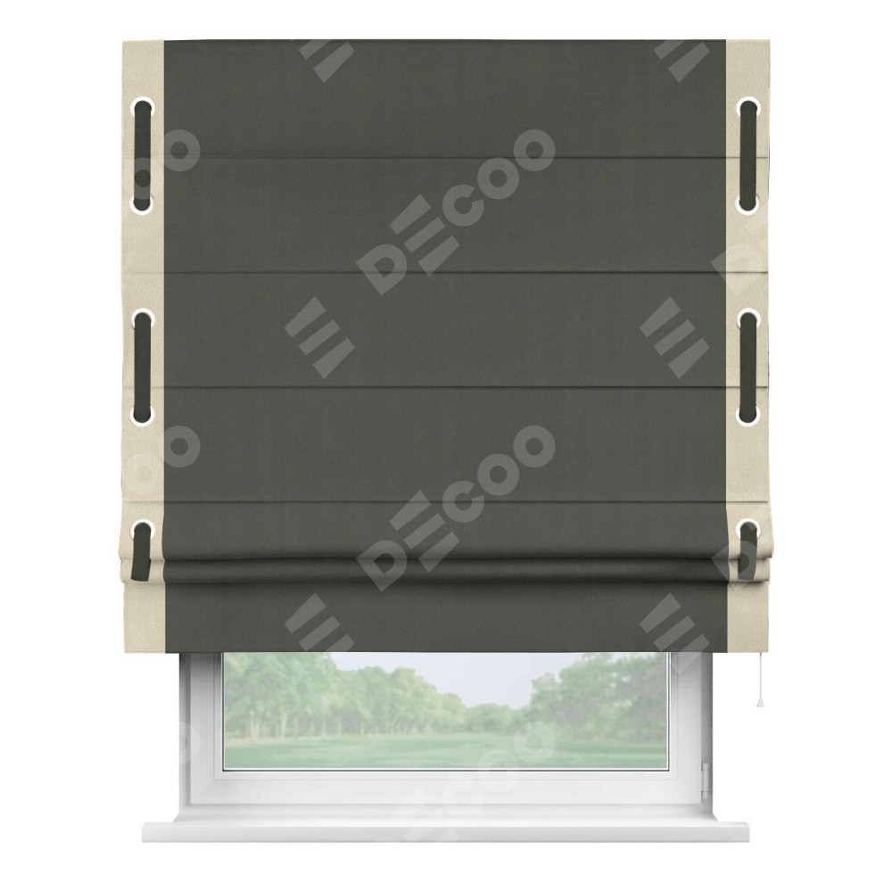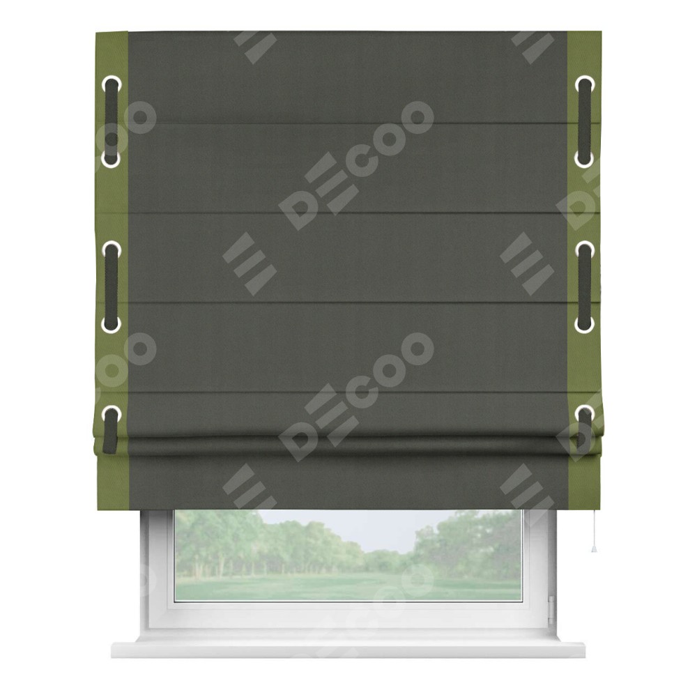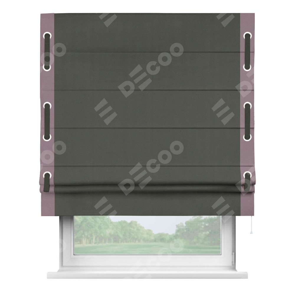 Римская штора «Кортин» для проема, блэкаут однотонный дымчато-серый с кантом Стрим Дуо (люверсы с пояском)