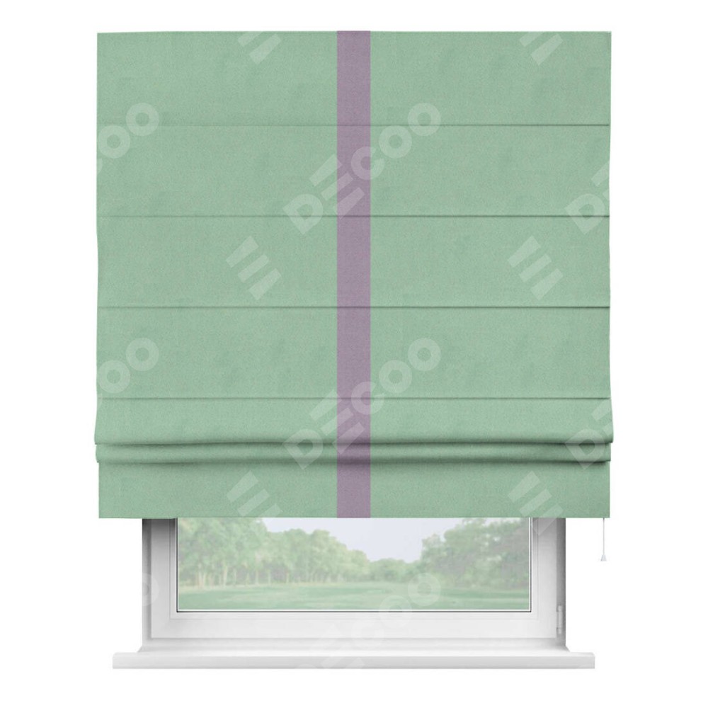 Римская штора производителя «Cortin», используется для проёма, пошита из ткани блэкаут однотонный ментоловый, артикул ткани 91572−1. Отделка шторы кантом «Хайвей», ткань для канта используется из блэкаута однотонного разной расцветки на выбор. Имеет универсальный механизм и подходит для монтажа: на потолок, на стену и в нишу.