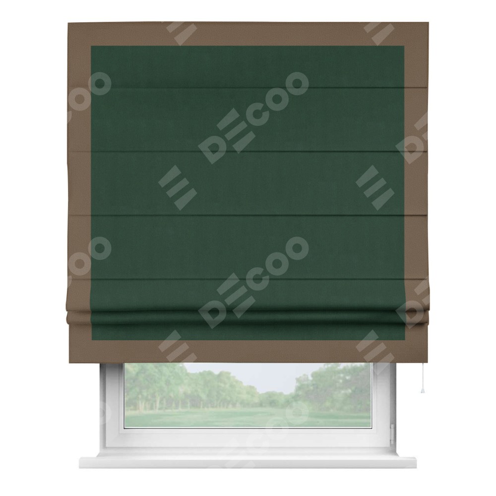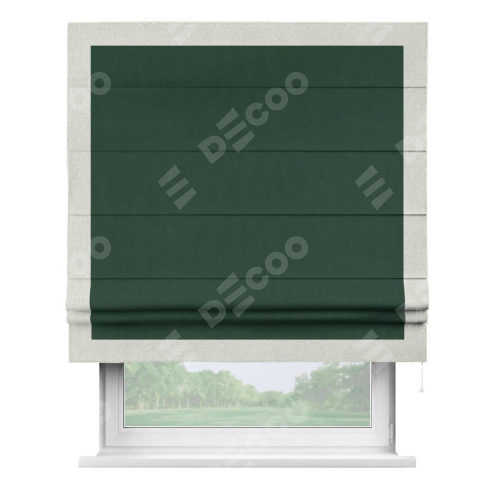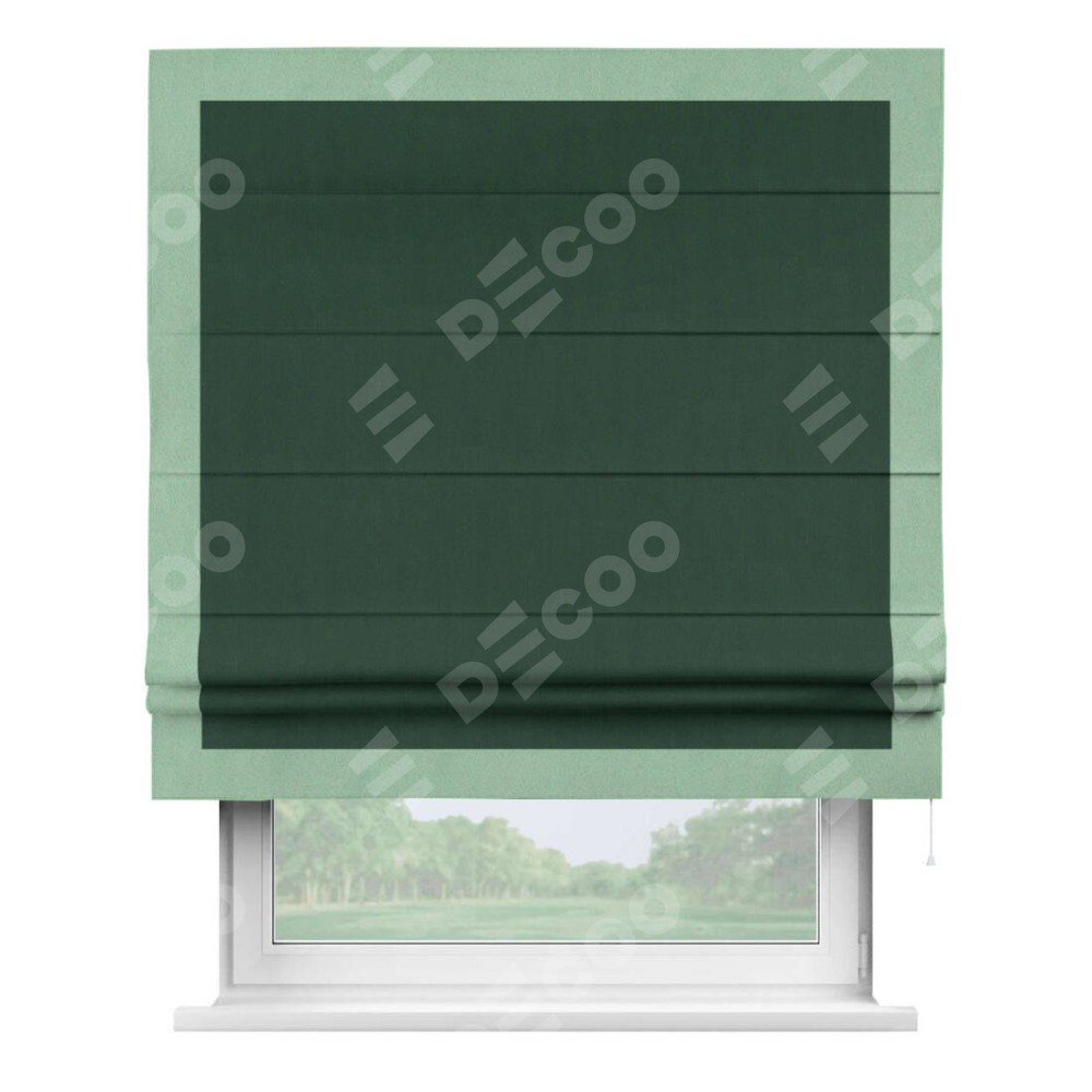 Римская штора производителя «Cortin», используется для проёма, пошита из ткани блэкаут однотонный зелёный, артикул ткани 91572−2. Отделка шторы кантом «Чесс», ткань для канта используется из блэкаута однотонного разной расцветки на выбор. Имеет универсальный механизм и подходит для монтажа: на потолок, на стену и в нишу.