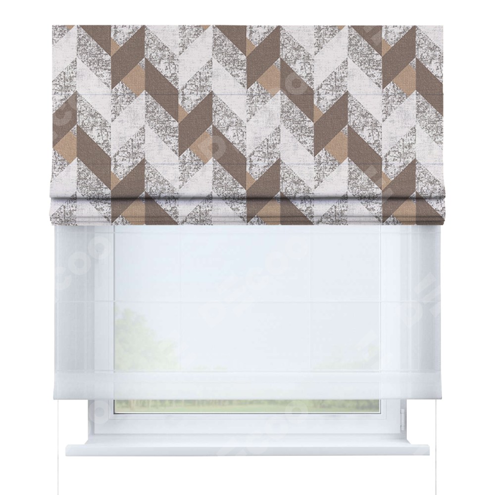 Двойная римская штора «День-ночь» от производителя Cortin предназначена для использования в проёмах. Эта штора уникальна тем, что состоит из двух полотен. На лицевой стороне находится блэкаут с нанесением сублимационной печати «Шеврон Либерти», обеспечивающий эффективное затемнение. В комплект также входит вторая ткань — легкий белый тюль (артикул: V-01), который добавляет изящества и легкости оформлению окна. Кроме того, доступны и другие разновидности ткани тюль, выбор которых доступен по ссылке .
