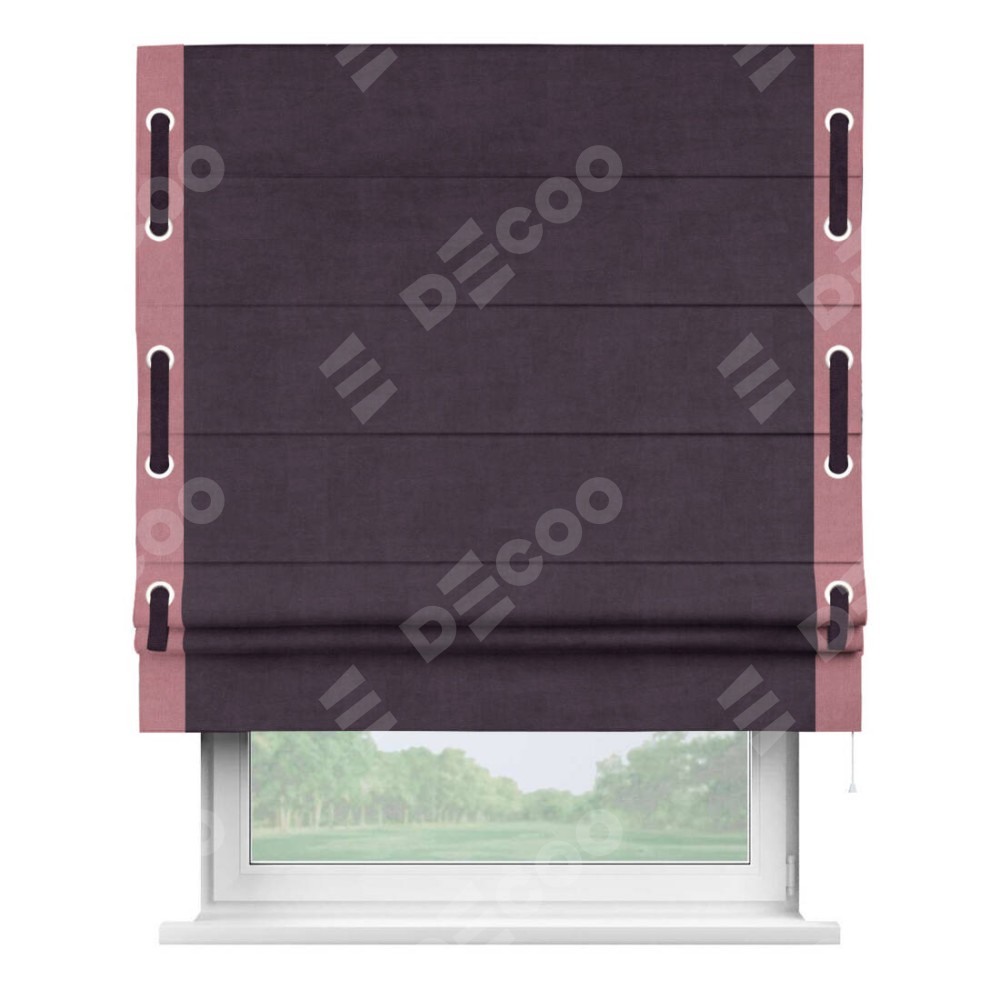 Римская штора производителя «Cortin», используется для проёма, пошита из ткани вельвет тёмно-фиолетовый, артикул ткани 72403. Отделка шторы кантом «Стрим Дуо» на кантах расположены люверсы с пояском, ткань для канта используется из вельвета разной расцветки на выбор. Ткань для пояска обычно используется из основной ткани шторы, а так же можно сделать из любой расцветки по желанию. Имеет универсальный механизм и подходит для монтажа: на потолок, на стену и в нишу.
