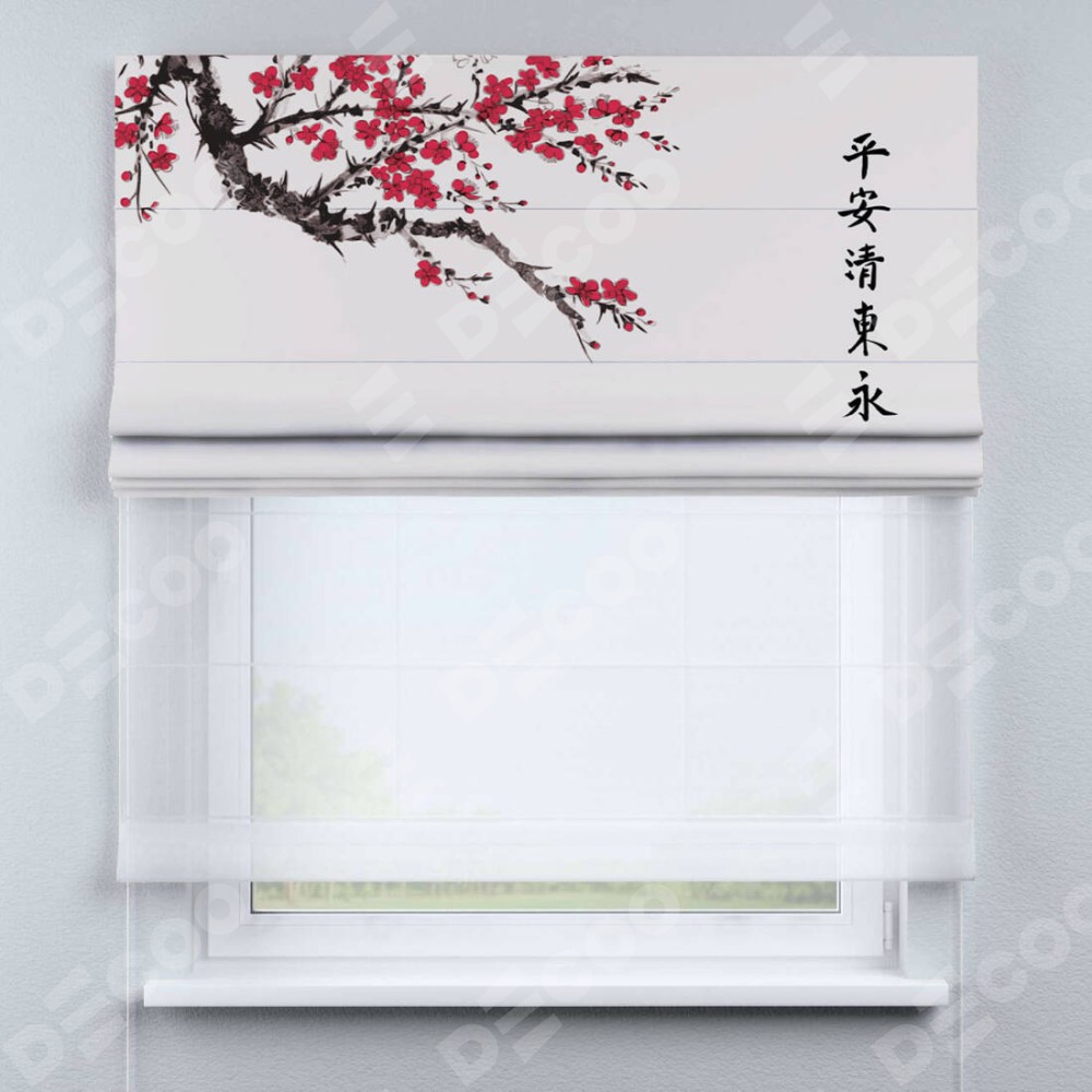 Двойная римская штора «День-ночь» от производителя Cortin предназначена для использования в проёмах. Эта штора уникальна тем, что состоит из двух полотен. На лицевой стороне находится блэкаут с нанесением сублимационной печати «Цветущая сакура», обеспечивающий эффективное затемнение. В комплект также входит вторая ткань — легкий белый тюль (артикул: V-01), который добавляет изящества и легкости оформлению окна. Кроме того, доступны и другие разновидности ткани тюль, выбор которых доступен по ссылке .