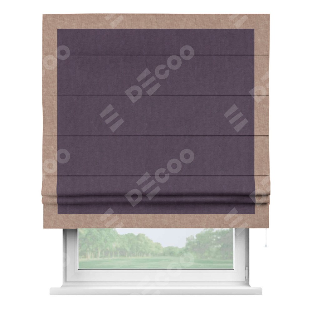 Римская штора производителя «Cortin», используется для проёма, пошита из ткани канвас баклажановый, артикул ткани v-111. Отделка шторы кантом «Чесс» (розовая пудра v-34), ткань для канта используется из канваса разной расцветки на выбор. Имеет универсальный механизм и подходит для монтажа: на потолок, на стену и в нишу.
