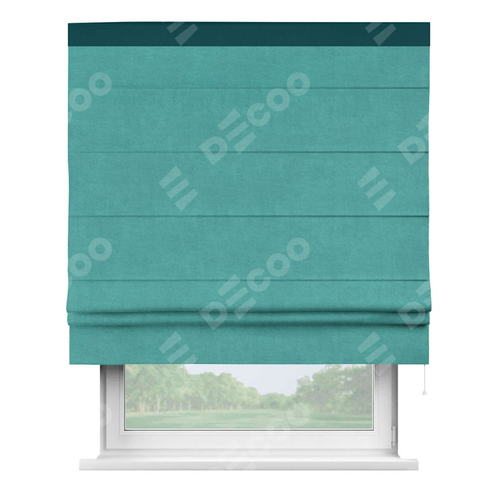 Римская штора производителя «Cortin», используется для проёма, пошита из ткани канвас бирюзовый, артикул ткани v-1048. Отделка шторы кантом «Кинг» (изумрудный v-12487), ткань для канта используется из канваса разной расцветки на выбор. Имеет универсальный механизм и подходит для монтажа: на потолок, на стену и в нишу.