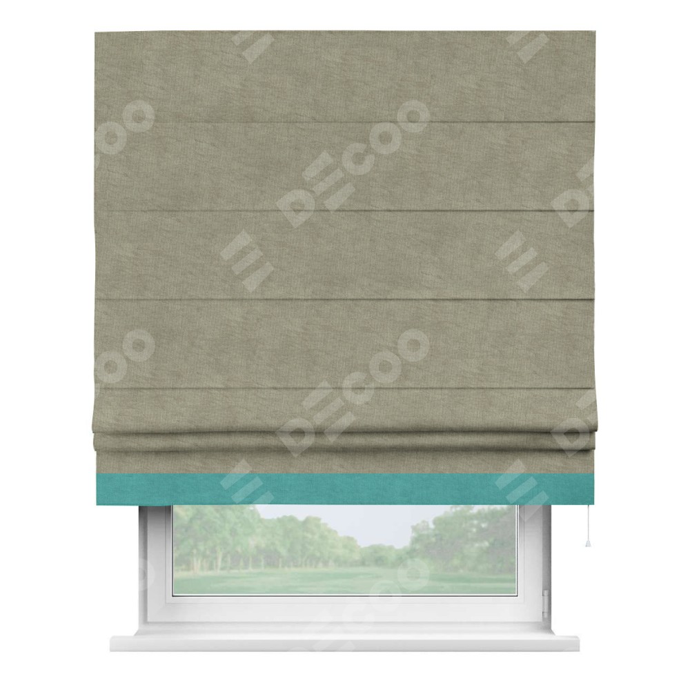 Римская штора производителя «Cortin», используется для проёма, пошита из ткани канвас капучино, артикул ткани v-211. Отделка шторы кантом «Джестер» (бирюзовый v-1048), ткань для канта используется из канваса разной расцветки на выбор. Имеет универсальный механизм и подходит для монтажа: на потолок, на стену и в нишу.