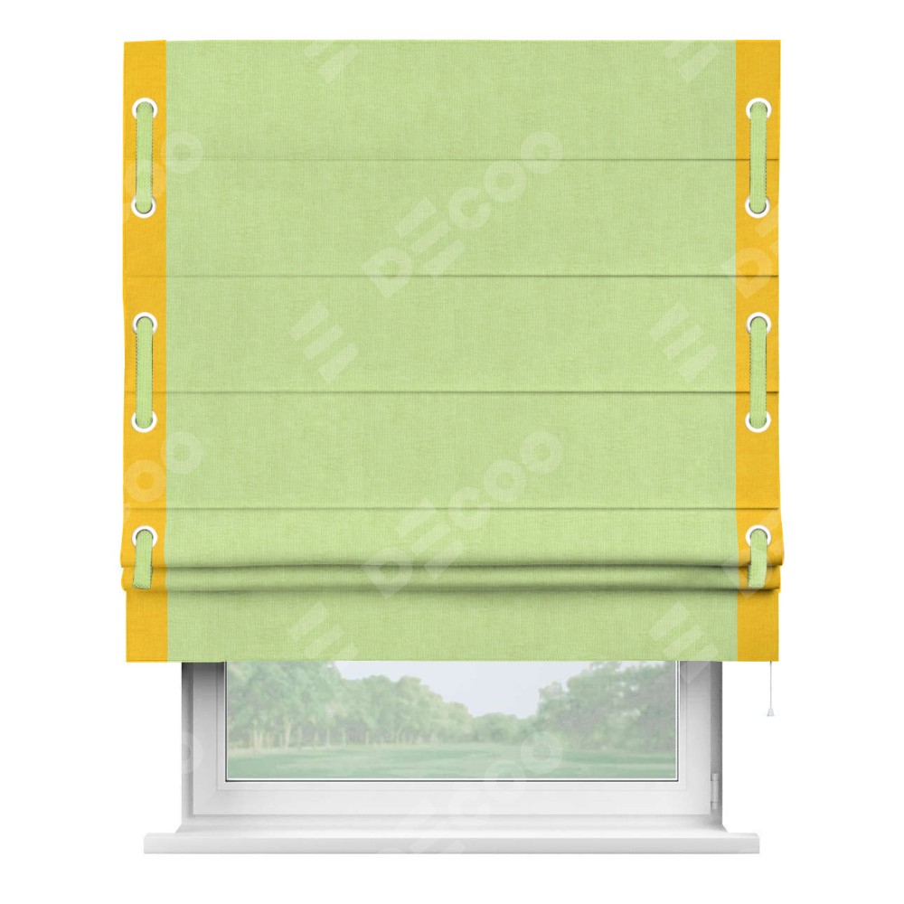 Римская штора производителя «Cortin», используется для проёма, пошита из ткани канвас липовый, артикул ткани v-207. Отделка шторы кантом «Стрим Дуо» (желтый v-344) на кантах расположены люверсы с пояском, ткань для канта используется из канваса разной расцветки на выбор. Ткань для пояска обычно используется из основной ткани шторы, а так же можно сделать из любой расцветки по желанию. Имеет универсальный механизм и подходит для монтажа: на потолок, на стену и в нишу.