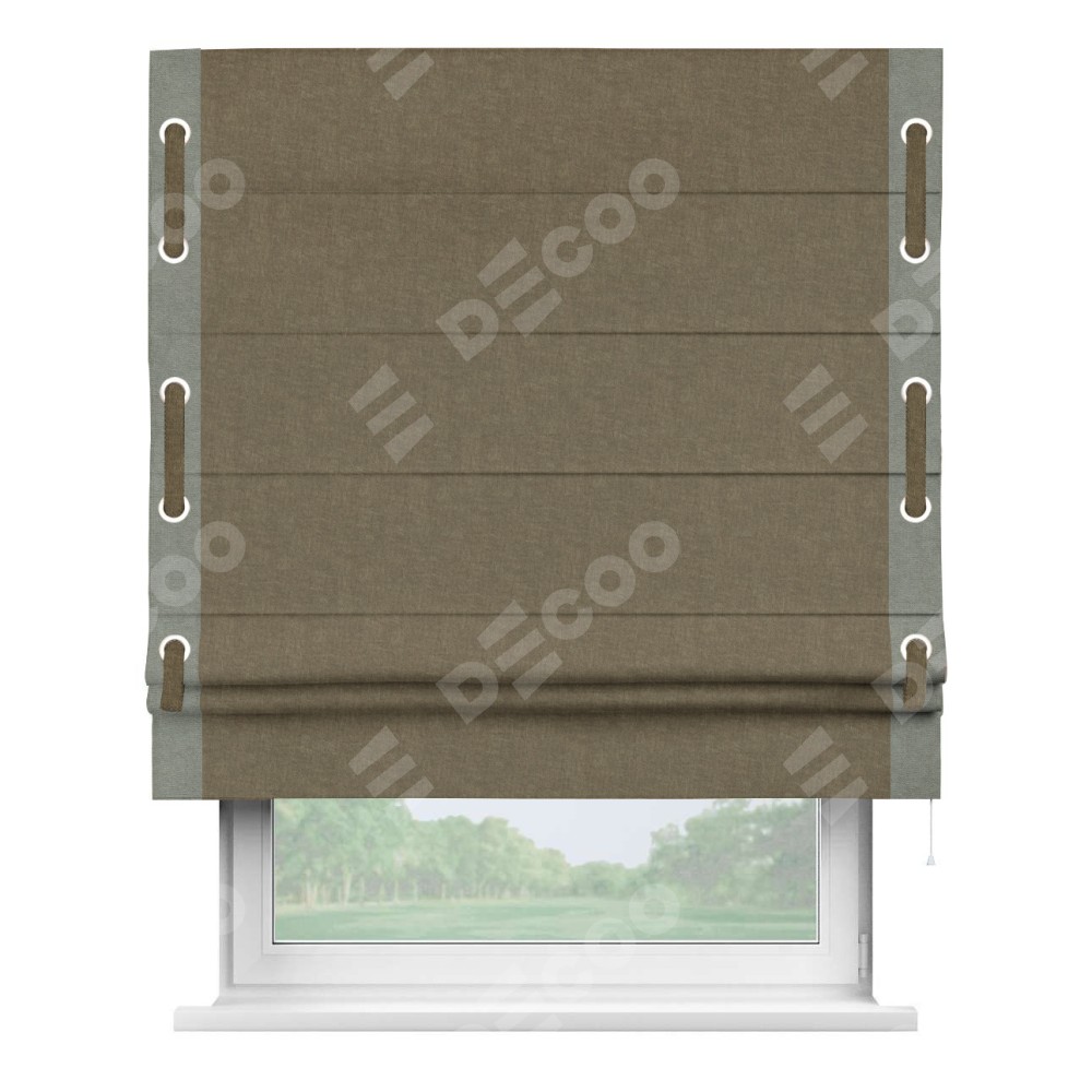 Римская штора «Кортин» для проема, канвас молочный шоколад, с кантом Стрим Дуо (люверсы с пояском)
