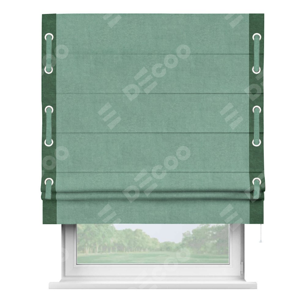 Римская штора производителя «Cortin», используется для проёма, пошита из ткани канвас мятный, артикул ткани v-248. Отделка шторы кантом «Стрим Дуо» (тёмно-зелёный v-469) на кантах расположены люверсы с пояском, ткань для канта используется из канваса разной расцветки на выбор. Ткань для пояска обычно используется из основной ткани шторы, а так же можно сделать из любой расцветки по желанию. Имеет универсальный механизм и подходит для монтажа: на потолок, на стену и в нишу.