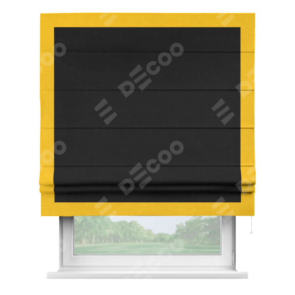 Римская штора производителя «Cortin», используется для проёма, пошита из ткани канвас черный, артикул ткани v-194. Отделка шторы кантом «Чесс» (желтый v-344), ткань для канта используется из канваса разной расцветки на выбор. Имеет универсальный механизм и подходит для монтажа: на потолок, на стену и в нишу.