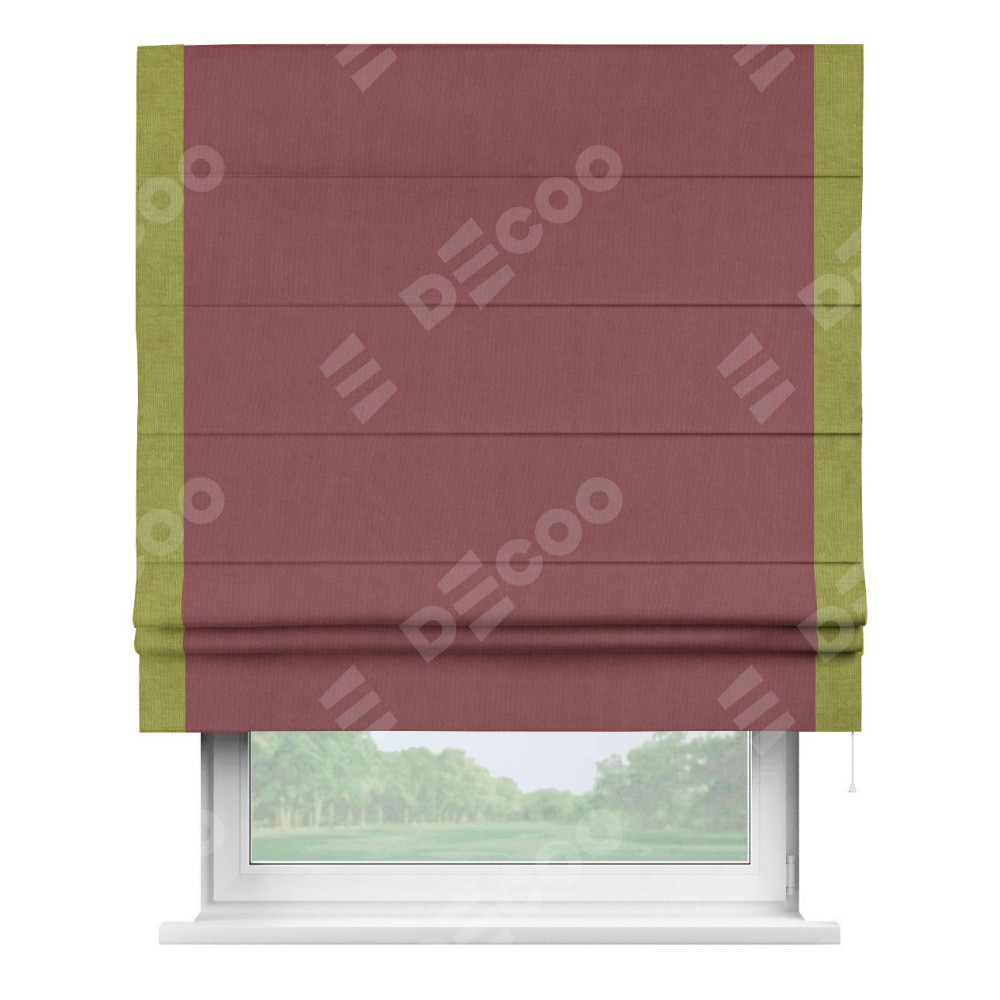 Римская штора производителя «Cortin», используется для проёма, пошита из ткани канвас ягодный, артикул ткани v-28. Отделка шторы кантом «Стрим Дуо» (зелёное яблоко v-370), ткань для канта используется из канваса разной расцветки на выбор. Имеет универсальный механизм и подходит для монтажа: на потолок, на стену и в нишу.