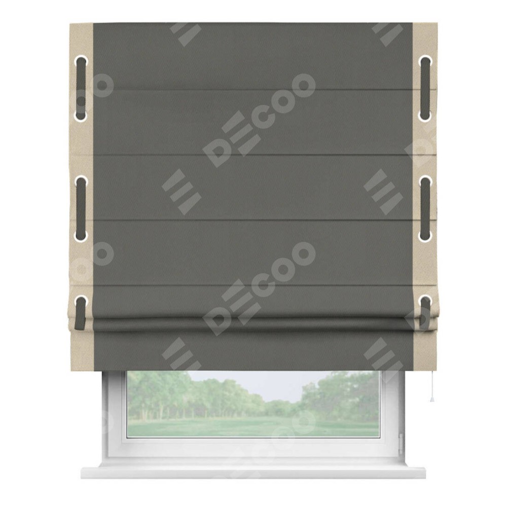Римская штора производителя «Cortin», используется для проёма, пошита из ткани блэкаут однотонный тёмно-серый, артикул ткани 91570. Отделка шторы кантом «Стрим Дуо» на кантах расположены люверсы с пояском, ткань для канта используется из блэкаута однотонного разной расцветки на выбор. Ткань для пояска обычно используется из основной ткани шторы, а так же можно сделать из любой расцветки по желанию. Имеет универсальный механизм и подходит для монтажа: на потолок, на стену и в нишу.