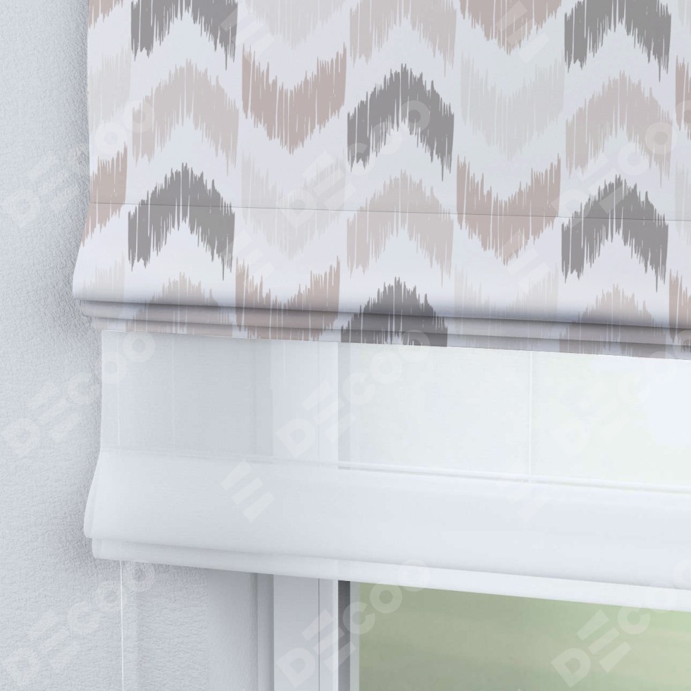 Двойная римская штора «День-ночь» от производителя Cortin предназначена для использования в проёмах. Эта штора уникальна тем, что состоит из двух полотен. На лицевой стороне находится блэкаут с нанесением сублимационной печати «Икат стрелки», обеспечивающий эффективное затемнение. В комплект также входит вторая ткань — легкий белый тюль (артикул: V-01), который добавляет изящества и легкости оформлению окна. Кроме того, доступны и другие разновидности ткани тюль, выбор которых доступен по ссылке .