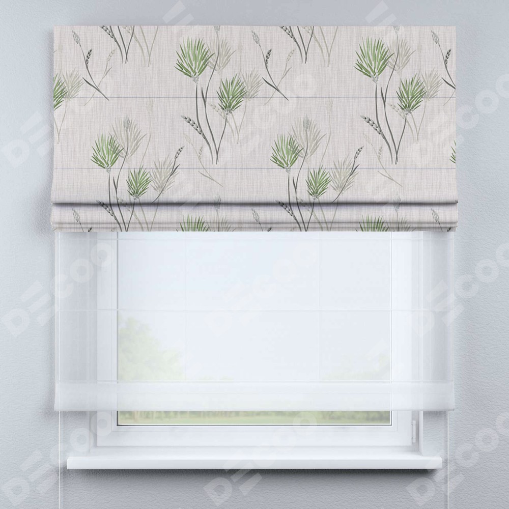 Двойная римская штора «День-ночь» от производителя Cortin предназначена для использования в проёмах. Эта штора уникальна тем, что состоит из двух полотен. На лицевой стороне находится блэкаут с нанесением сублимационной печати «Полевые травы бежевый», обеспечивающий эффективное затемнение. В комплект также входит вторая ткань — легкий белый тюль (артикул: V-01), который добавляет изящества и легкости оформлению окна. Кроме того, доступны и другие разновидности ткани тюль, выбор которых доступен по ссылке .