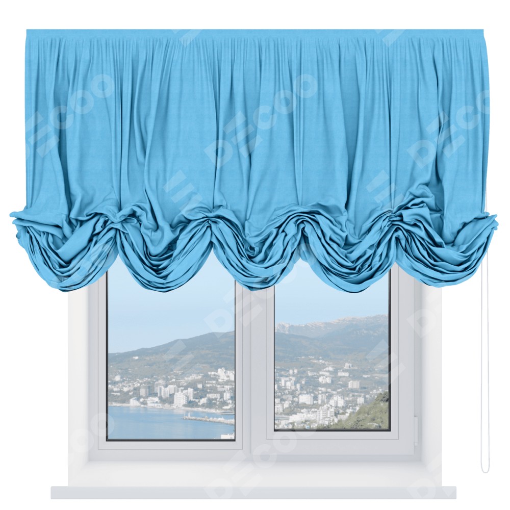 Австрийская штора производителя «Cortin», используется для проёма, пошита из ткани вельвет голубой, артикул ткани 85544. Имеет универсальный механизм и подходит для монтажа: на потолок и на стену.