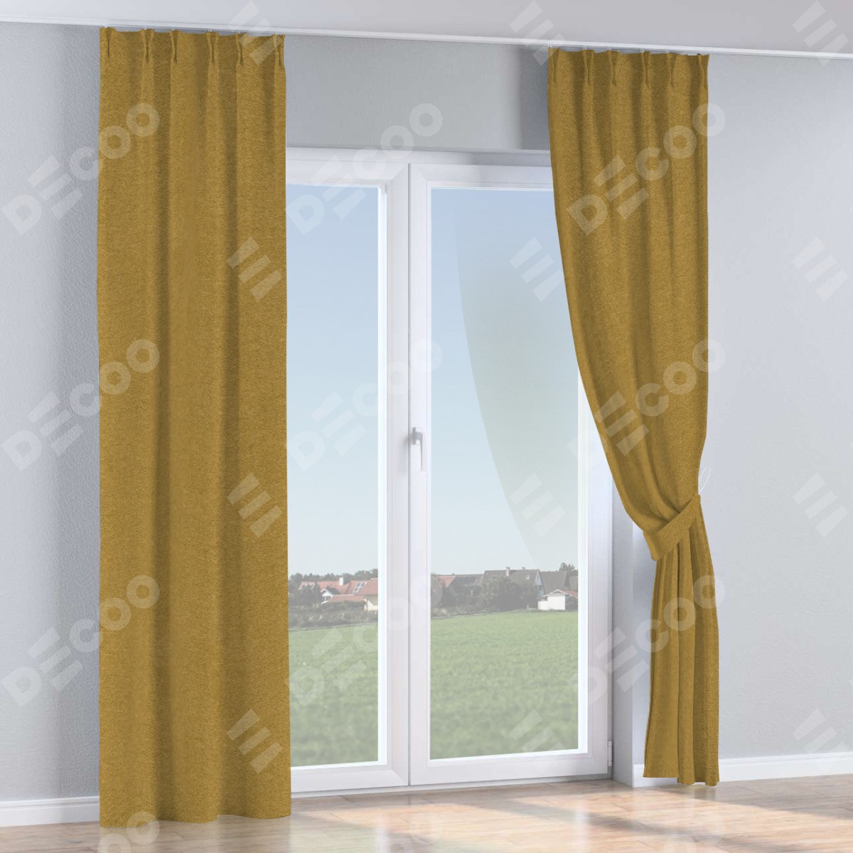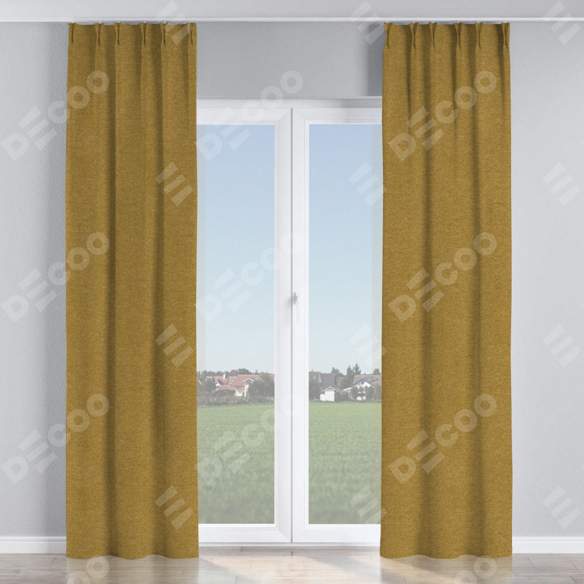 Комплект прямых штор, от производителя «Cortin», пошиты из ткани твид блэкаут горчица, артикул ткани 91237. С изнаночной стороны в верхней части штор пристрачивается шторная лента с декоративными складками «Кустик». Для создания элегантных складок прямые шторы шьются по стандарту с коэффициентом 1:2 (на 100 см. ширины проёма 200 см. ширины ткани).