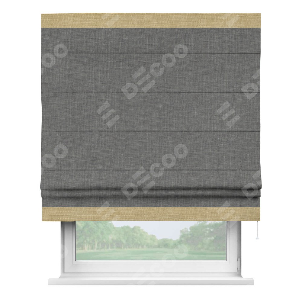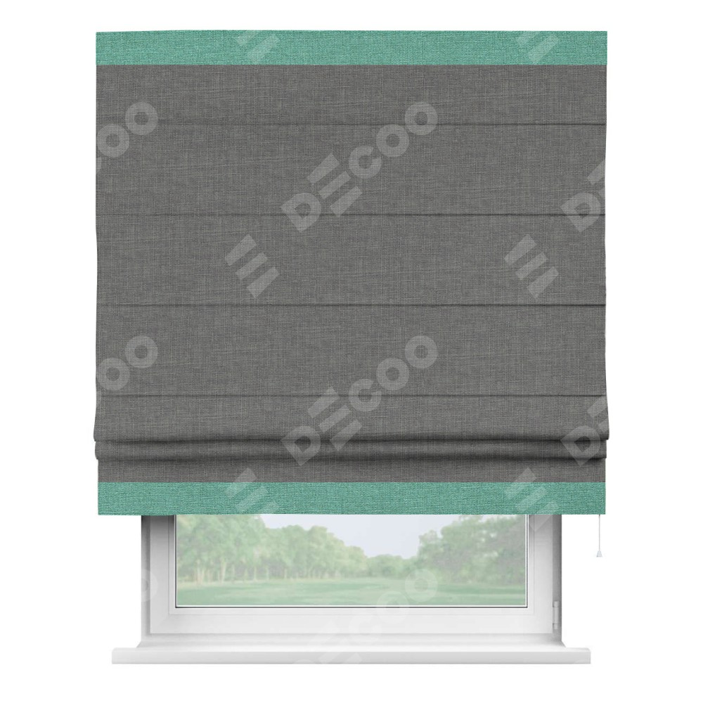 Римская штора производителя «Cortin», используется для проёма, пошита из ткани лён тёмно-серый, артикул 7441. Отделка шторы кантом «Горизонт», ткань для канта используется из льна разной расцветки на выбор. Имеет универсальный механизм и подходит для монтажа: на потолок, на стену и в нишу.