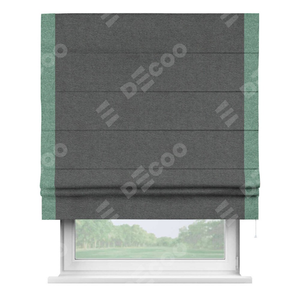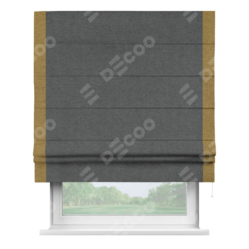 Римская штора производителя «Cortin», используется для проёма, пошита из ткани твид блэкаут тёмно-серый, артикул 90938. Отделка шторы кантом «Стрим Дуо», ткань для канта используется из твида разной расцветки на выбор. Имеет универсальный механизм и подходит для монтажа: на потолок, на стену и в нишу.