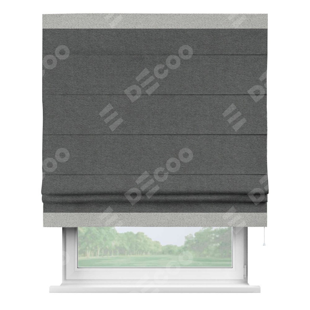 Римская штора производителя «Cortin», используется для проёма, пошита из ткани твид блэкаут тёмно-серый, артикул 90938. Отделка шторы кантом «Горизонт», ткань для канта используется из твида разной расцветки на выбор. Имеет универсальный механизм и подходит для монтажа: на потолок, на стену и в нишу.