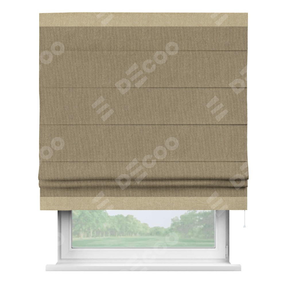 Римская штора пошита из ткани лён димаут тёмно-бежевый, артикул: 16261, с отделкой кантом «Горизонт» предлагает уникальное дизайнерское решение, при котором кант располагается только вверху и снизу шторы. Такое решение делает акцент на горизонтальных линиях, визуально расширяя пространство и придавая окну более строгий и организованный вид. Отделка кантом в этих ключевых местах не только украшает штору, но и способствует её долговечности, защищая наиболее уязвимые к износу края.