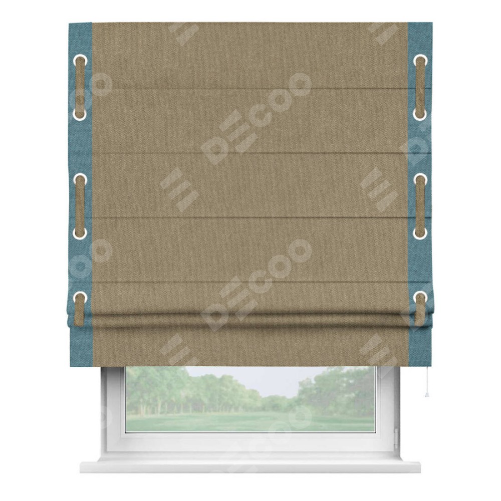 Римская штора пошита из ткани лён димаут тёмно-бежевый, артикул: 16261, с отделкой кантом «Стрим Дуо», дополненная декоративными люверсами на этих кантах и протянутым пояском из основного цвета римской шторы, представляет собой высоко декоративное и функциональное решение для оконного оформления. Канты, расположенные по обеим боковым сторонам шторы, уже добавляют изысканности и завершенности внешнему виду. Добавление люверсов и пояска не только усиливает декоративный эффект, но и придает шторе дополнительную текстурность и глубину.