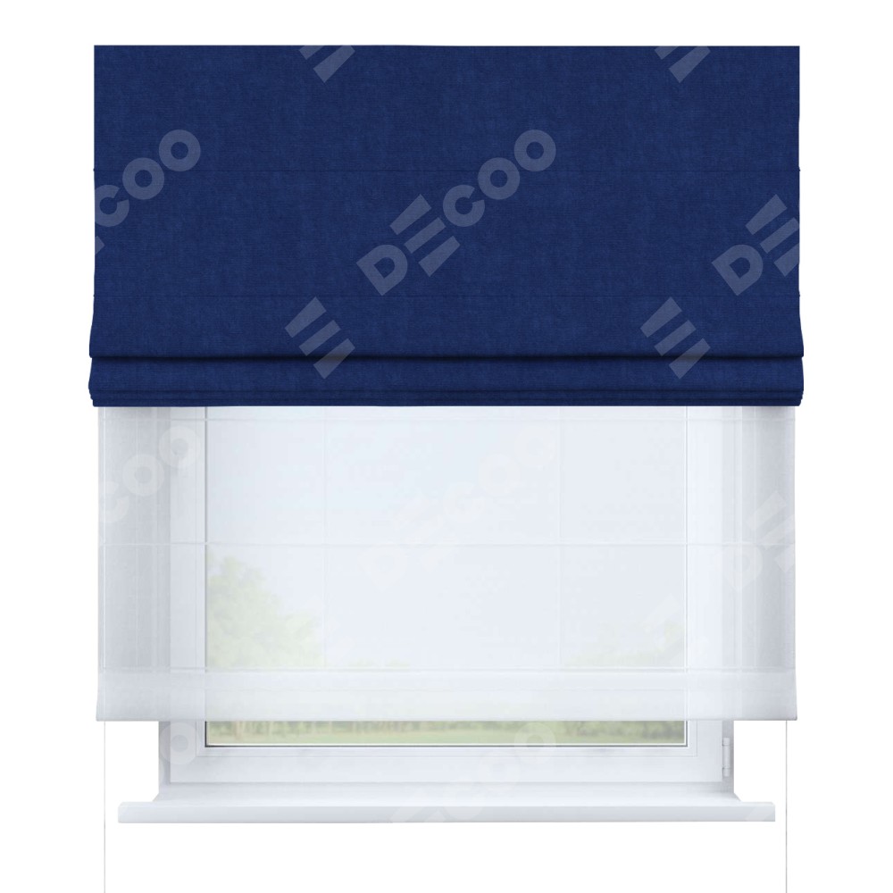Двойная римская штора «День-ночь» от производителя Cortin предназначена для использования в проёмах. Эта штора уникальна тем, что состоит из двух полотен. На лицевой стороне находится канвас синий электрик (артикул: v-355), обеспечивающий мягкое затемнение. В комплект также входит вторая ткань — легкий белый тюль (артикул: V-01), который добавляет изящества и легкости оформлению окна. Кроме того, доступны и другие разновидности ткани тюль, выбор которых доступен по  ссылке .