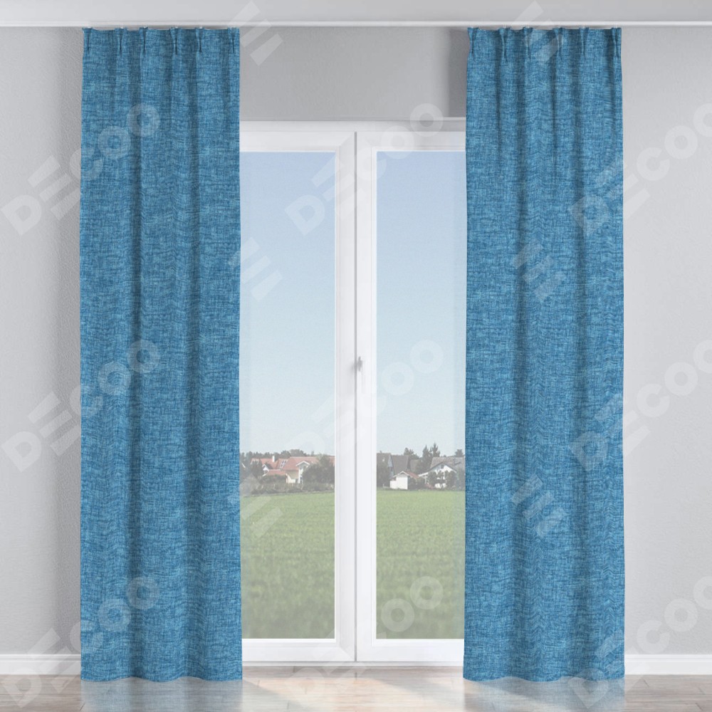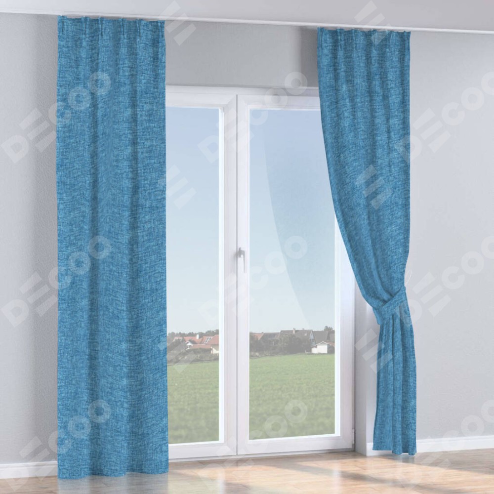 Комплект прямых штор, от производителя «Cortin», пошиты из ткани рогожка димаут джинс, артикул ткани 91026. С изнаночной стороны в верхней части штор пристрачивается шторная лента с декоративными складками «Кустик». Для создания элегантных складок прямые шторы шьются по стандарту с коэффициентом 1:2 (на 100 см. ширины проёма 200 см. ширины ткани).