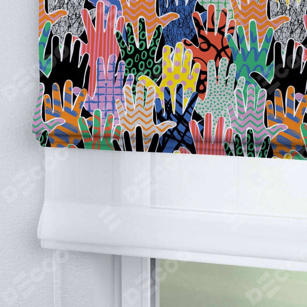 Двойная римская штора «День-ночь» от производителя Cortin предназначена для использования в проёмах. Эта штора уникальна тем, что состоит из двух полотен. На лицевой стороне находится блэкаут с нанесением сублимационной печати «Коллаж поп-арт», обеспечивающий эффективное затемнение. В комплект также входит вторая ткань — легкий белый тюль (артикул: V-01), который добавляет изящества и легкости оформлению окна. Кроме того, доступны и другие разновидности ткани тюль, выбор которых доступен по ссылке .