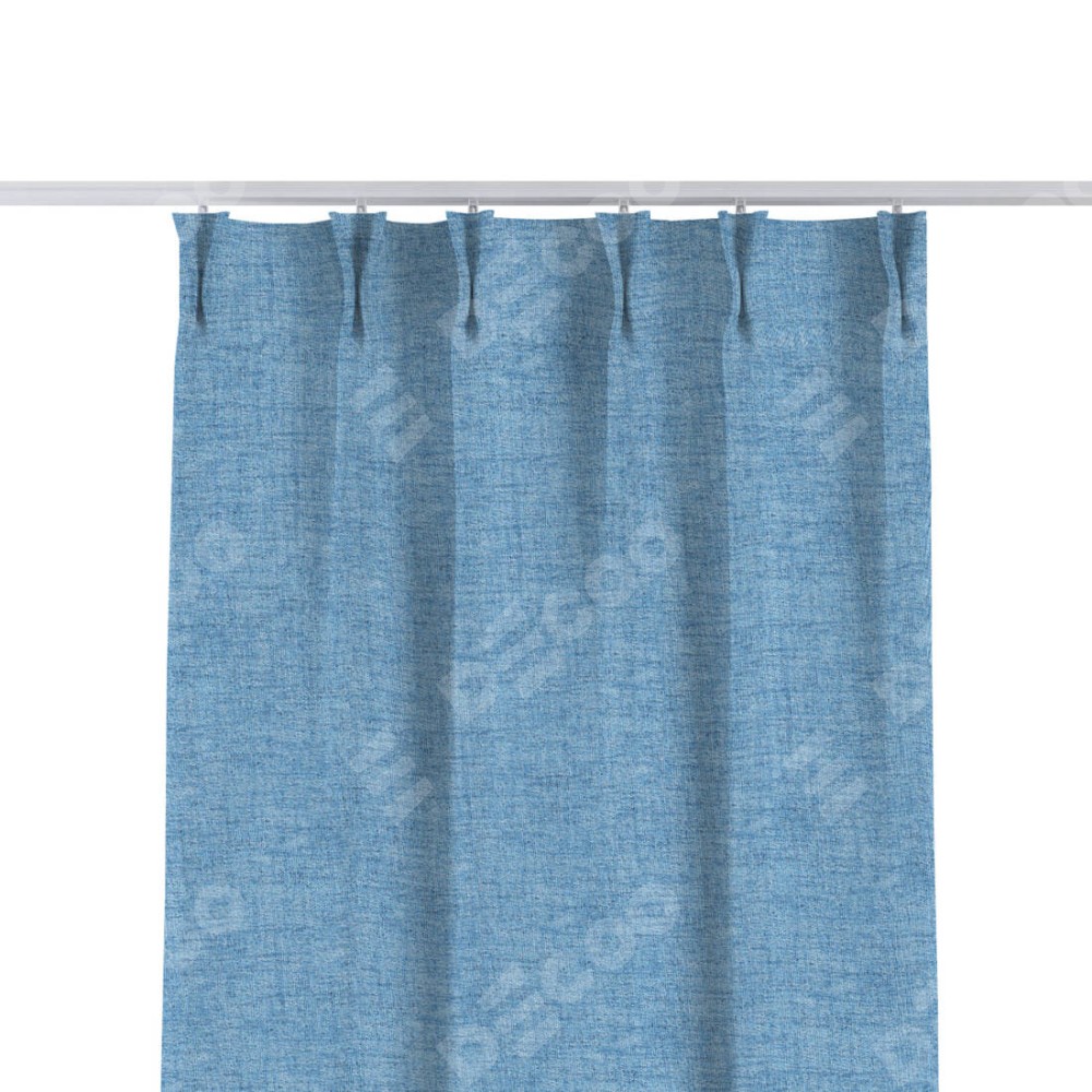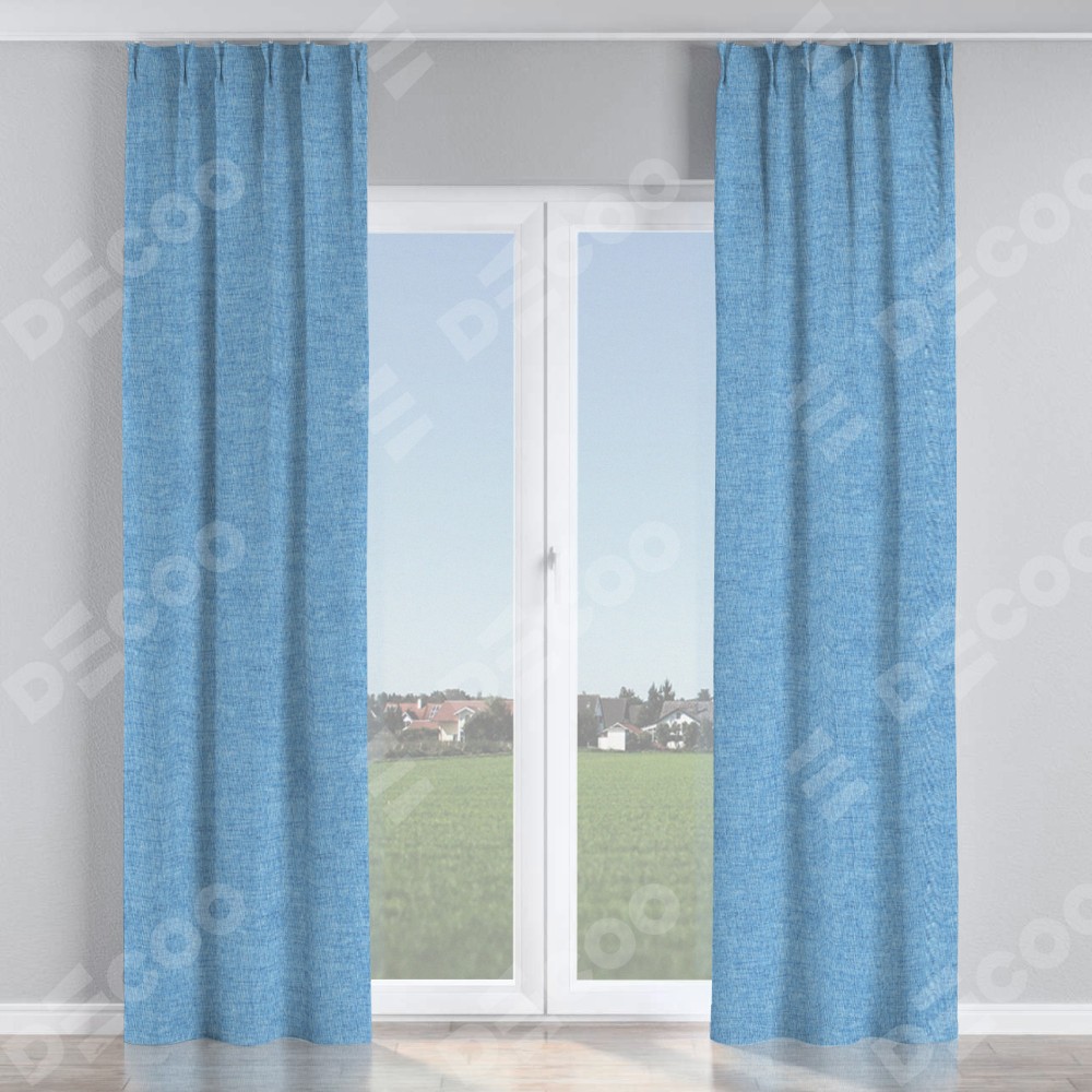 Комплект прямых штор, от производителя «Cortin», пошиты из ткани рогожка димаут голубой, артикул ткани 91025. С изнаночной стороны в верхней части штор пристрачивается шторная лента с декоративными складками «Кустик». Для создания элегантных складок прямые шторы шьются по стандарту с коэффициентом 1:2 (на 100 см. ширины проёма 200 см. ширины ткани).