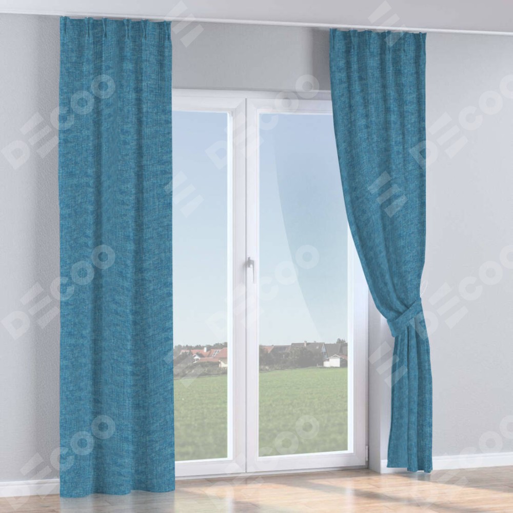 Комплект прямых штор, от производителя «Cortin», пошиты из ткани рогожка димаут лазурно-синий, артикул ткани 91024. С изнаночной стороны в верхней части штор пристрачивается шторная лента с декоративными складками «Кустик». Для создания элегантных складок прямые шторы шьются по стандарту с коэффициентом 1:2 (на 100 см. ширины проёма 200 см. ширины ткани).