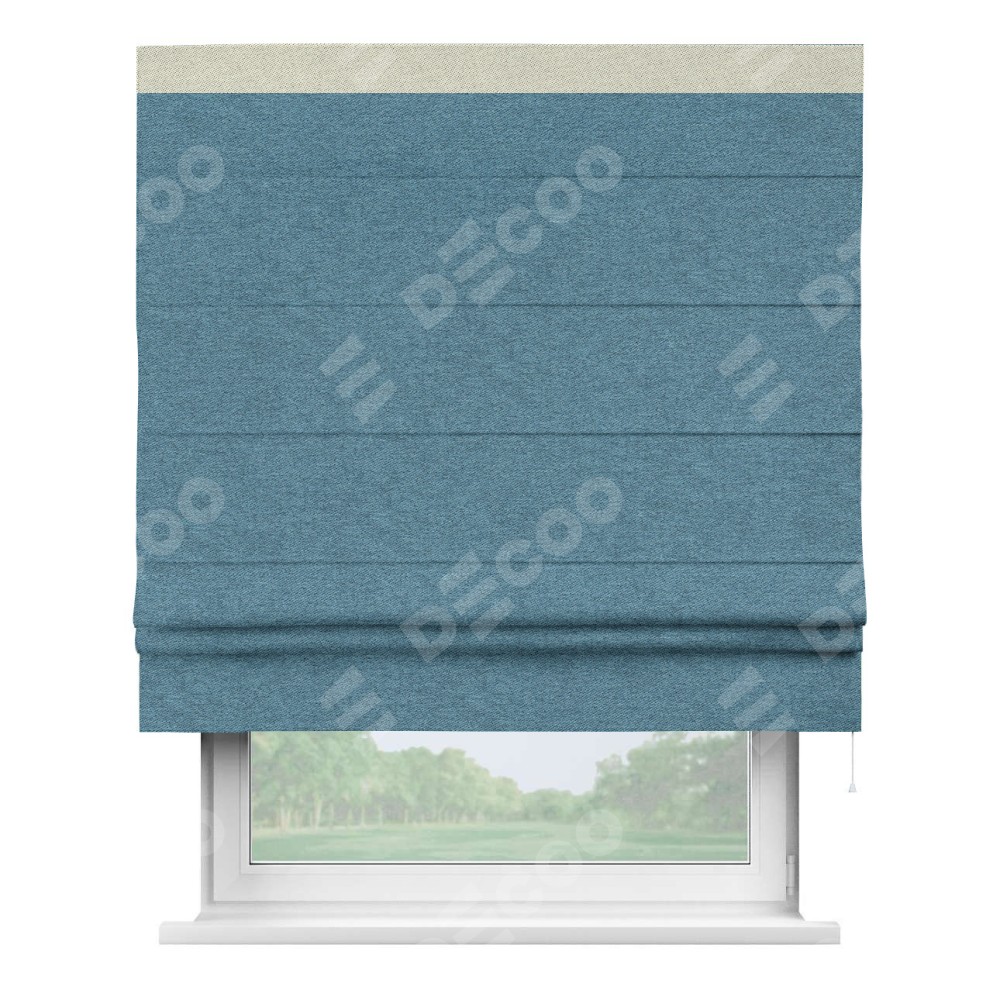 Римская штора пошита из ткани твид блэкаут светло-синий, артикул: 90935, с отделкой кантом «Кинг» отличается своей необычной особенностью: кант располагается исключительно сверху шторы. Такой дизайн делает акцент на верхней части окна, визуально поднимая потолок и придавая интерьеру более возвышенный и изысканный вид. Отделка кантом на верхней кромке не только украшает штору, но и может служить дополнительной защитой от износа в месте наибольшего контакта с механизмом управления шторой.