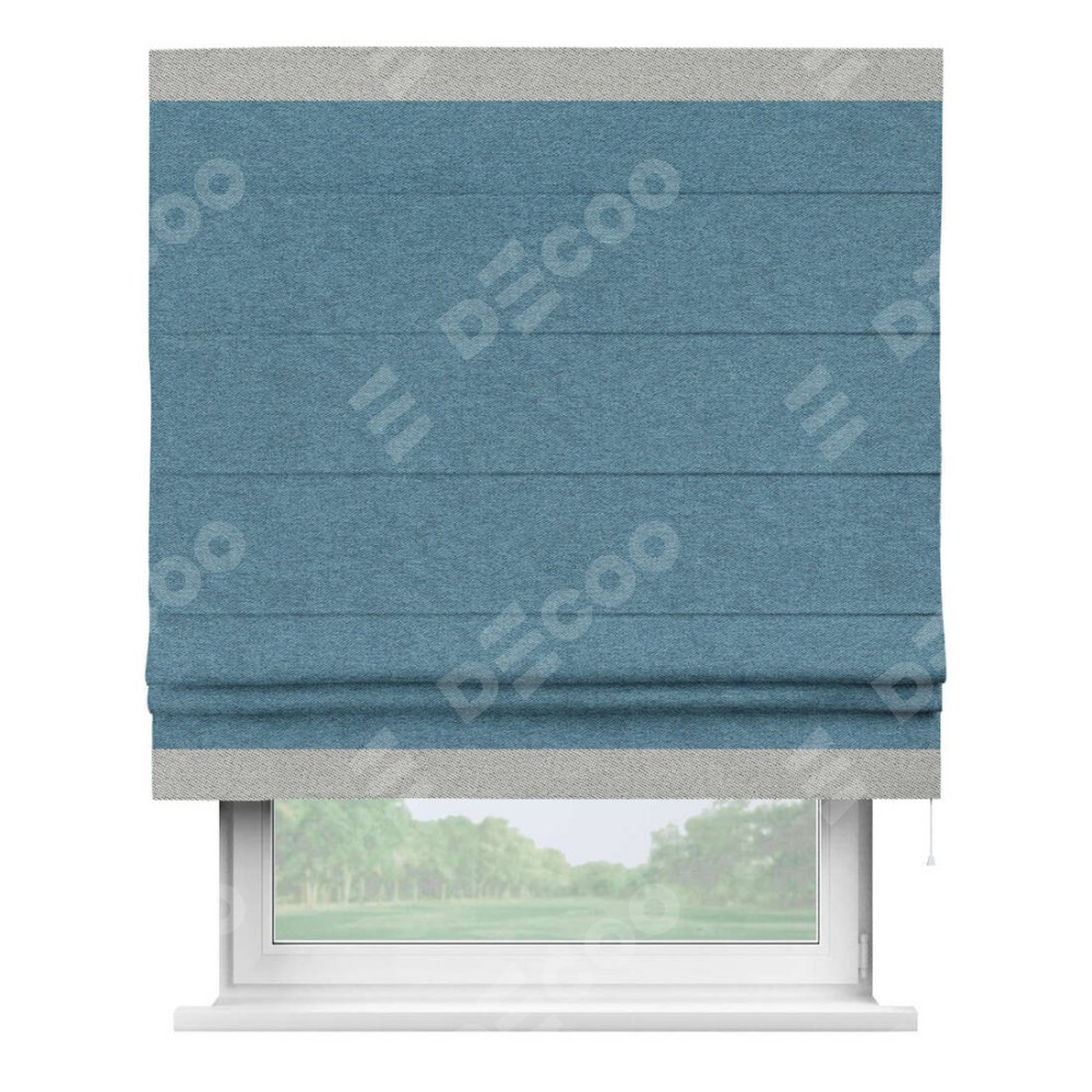 Римская штора пошита из ткани твид блэкаут светло-синий, артикул: 90935, с отделкой кантом «Горизонт» предлагает уникальное дизайнерское решение, при котором кант располагается только вверху и снизу шторы. Такое решение делает акцент на горизонтальных линиях, визуально расширяя пространство и придавая окну более строгий и организованный вид. Отделка кантом в этих ключевых местах не только украшает штору, но и способствует её долговечности, защищая наиболее уязвимые к износу края.