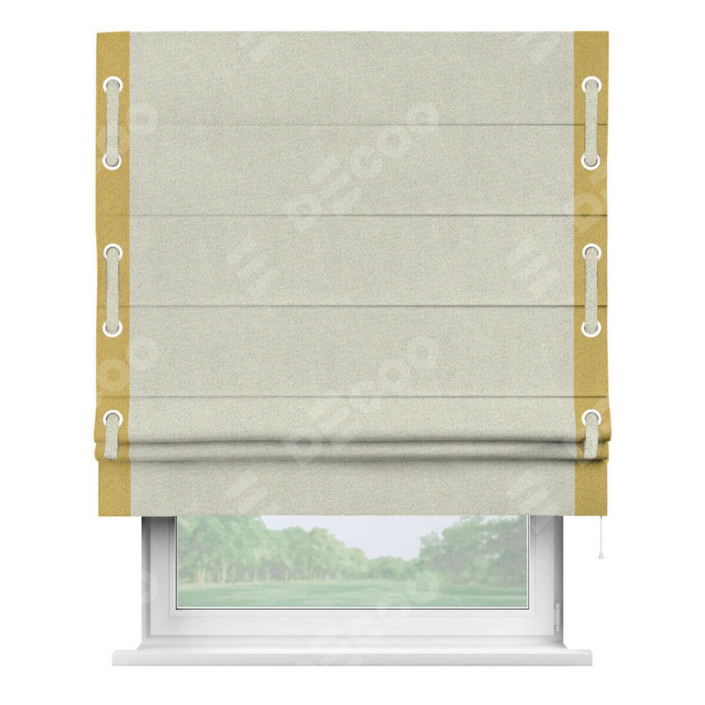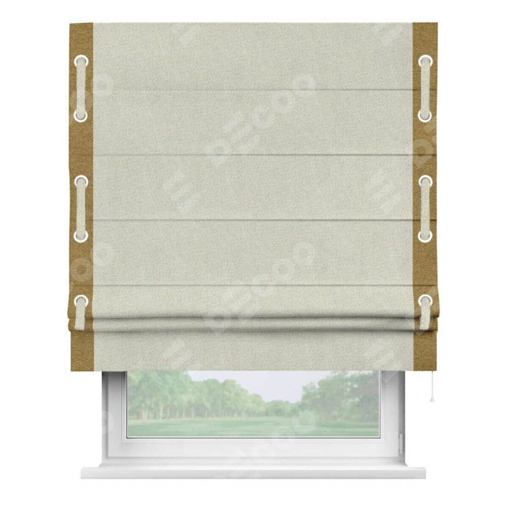 Римская штора пошита из ткани твид блэкаут шампань, артикул: 90929, с отделкой кантом «Стрим Дуо», дополненная декоративными люверсами на этих кантах и протянутым пояском из основного цвета римской шторы, представляет собой высоко декоративное и функциональное решение для оконного оформления. Канты, расположенные по обеим боковым сторонам шторы, уже добавляют изысканности и завершенности внешнему виду. Добавление люверсов и пояска не только усиливает декоративный эффект, но и придает шторе дополнительную текстурность и глубину.