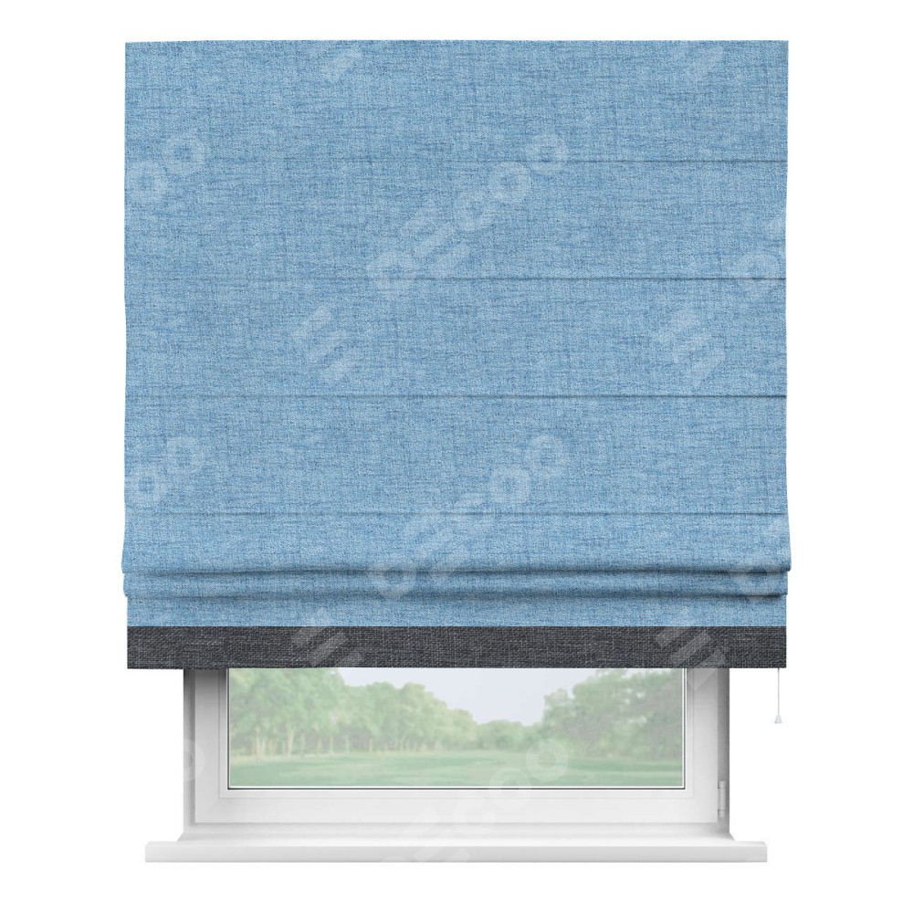 Римская штора пошита из ткани рогожка димаут голубой, артикул: 91025, с отделкой кантом «Джестер» выделяется своей уникальной особенностью — кантом, расположенным только снизу шторы. Этот дизайн добавляет оригинальности и игривости оконному оформлению, делая акцент на нижней части шторы и создавая интересный визуальный эффект. Отделка кантом на нижнем крае не только служит эстетической функции, но и способствует увеличению прочности и износостойкости ткани в этом месте.