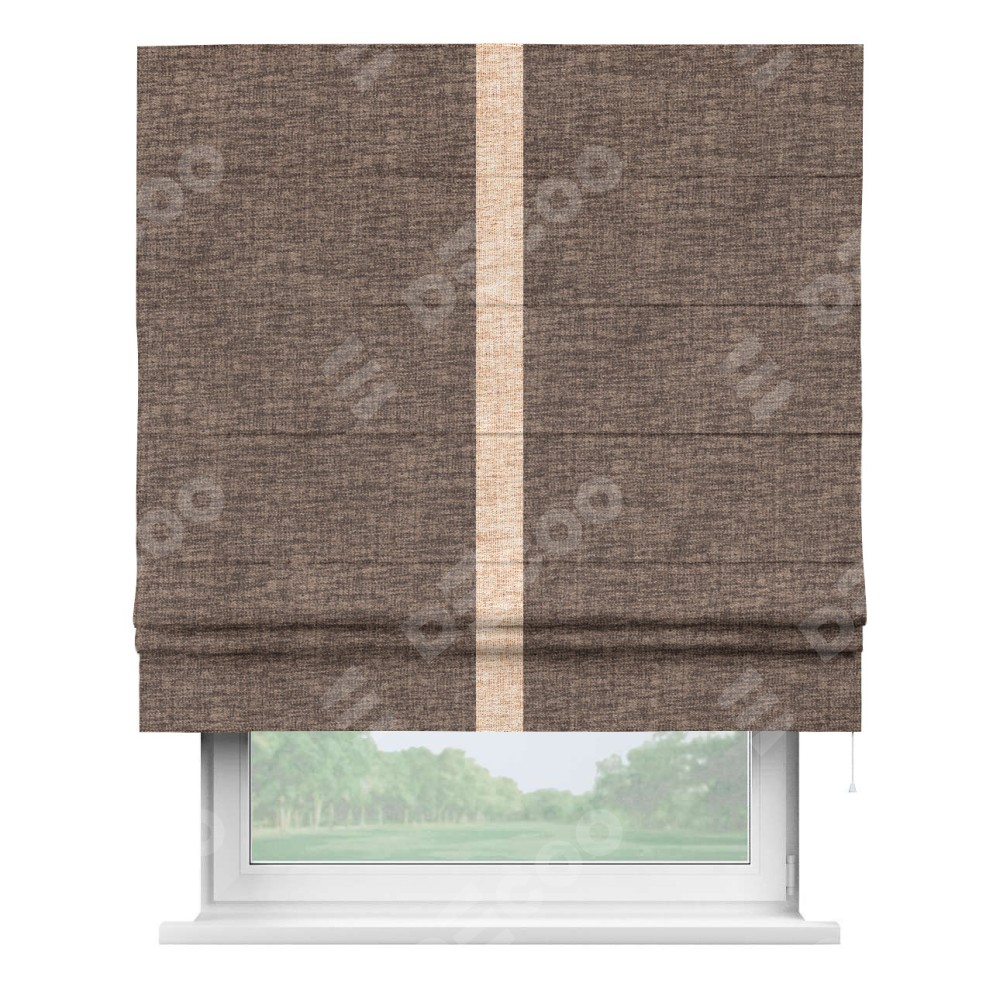 Римская штора пошита из ткани рогожка димаут коричневый, артикул: 91018, с отделкой кантом «Хайвэй» представляет собой уникальное и смелое дизайнерское решение, где кант расположен вертикально посередине шторы. Этот дизайн не только выделяет штору среди других вариантов оформления окон, но и создает интересный визуальный акцент, привлекая внимание к центру окна и разделяя штору на визуальные зоны. Такой нестандартный подход добавляет динамичности интерьеру и может быть использован для подчеркивания особенностей оформления помещения.
