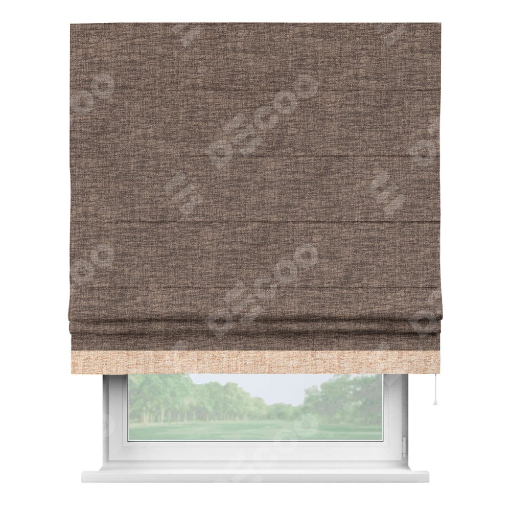 Римская штора пошита из ткани рогожка димаут коричневый, артикул: 91018, с отделкой кантом «Джестер» выделяется своей уникальной особенностью — кантом, расположенным только снизу шторы. Этот дизайн добавляет оригинальности и игривости оконному оформлению, делая акцент на нижней части шторы и создавая интересный визуальный эффект. Отделка кантом на нижнем крае не только служит эстетической функции, но и способствует увеличению прочности и износостойкости ткани в этом месте.