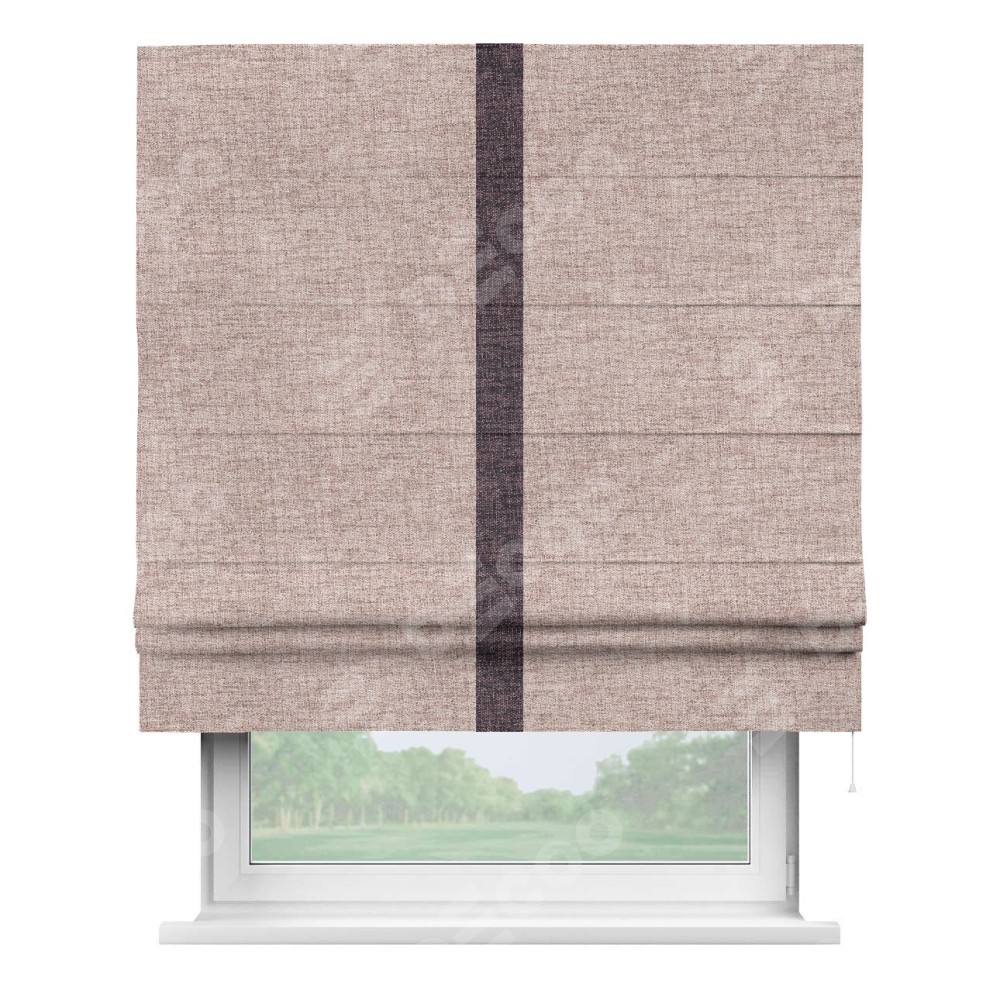 Римская штора пошита из ткани рогожка димаут пыльный розовый, артикул: 91019, с отделкой кантом «Хайвэй» представляет собой уникальное и смелое дизайнерское решение, где кант расположен вертикально посередине шторы. Этот дизайн не только выделяет штору среди других вариантов оформления окон, но и создает интересный визуальный акцент, привлекая внимание к центру окна и разделяя штору на визуальные зоны. Такой нестандартный подход добавляет динамичности интерьеру и может быть использован для подчеркивания особенностей оформления помещения.