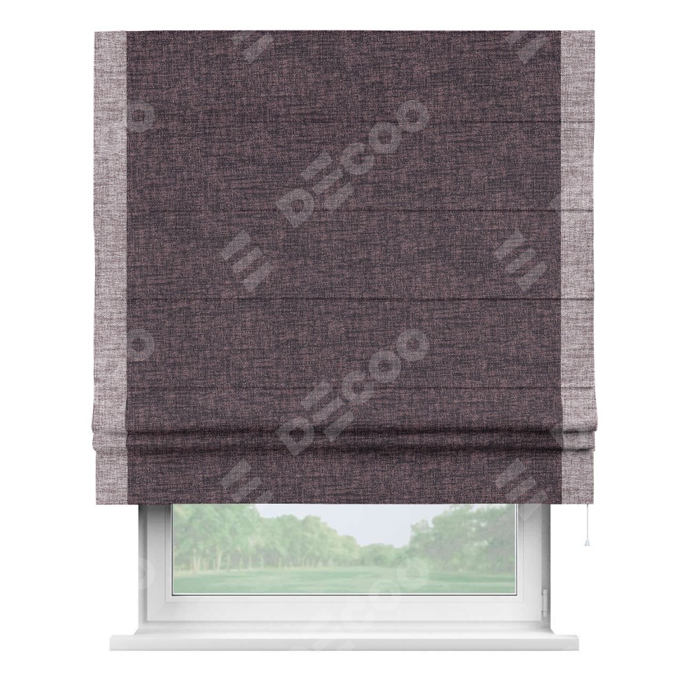 Римская штора пошита из ткани рогожка димаут розово-коричневый, артикул: 91020, с отделкой кантом «Стрим Дуо» выделяется наличием кантов по обоим бокам шторы, слева и справа. Этот дизайн придает шторе аккуратный и завершенный вид, акцентируя вертикальные линии и визуально вытягивая окно в высоту. Отделка кантом по бокам не только украшает штору, но и служит практической функцией, укрепляя края и продлевая срок службы изделия.
