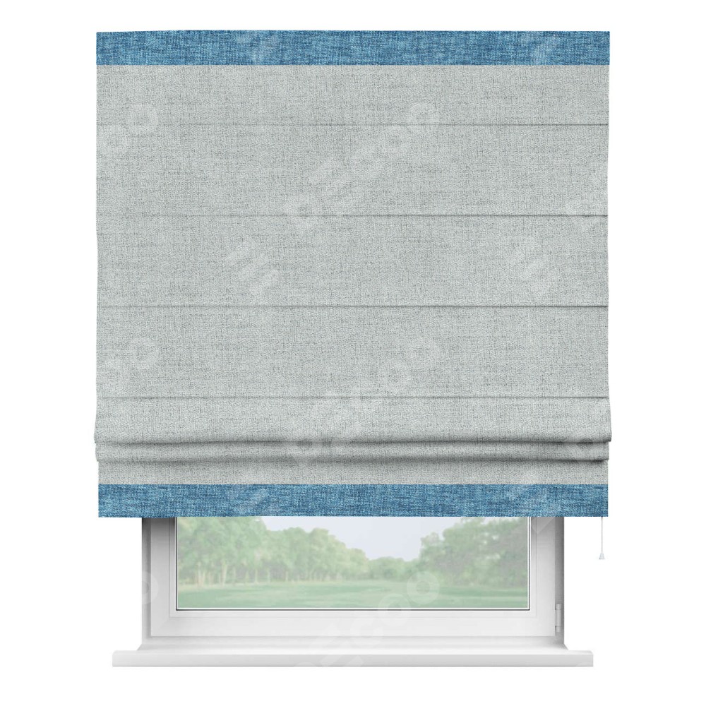 Римская штора пошита из ткани рогожка димаут серый, артикул: 91027, с отделкой кантом «Горизонт» предлагает уникальное дизайнерское решение, при котором кант располагается только вверху и снизу шторы. Такое решение делает акцент на горизонтальных линиях, визуально расширяя пространство и придавая окну более строгий и организованный вид. Отделка кантом в этих ключевых местах не только украшает штору, но и способствует её долговечности, защищая наиболее уязвимые к износу края.