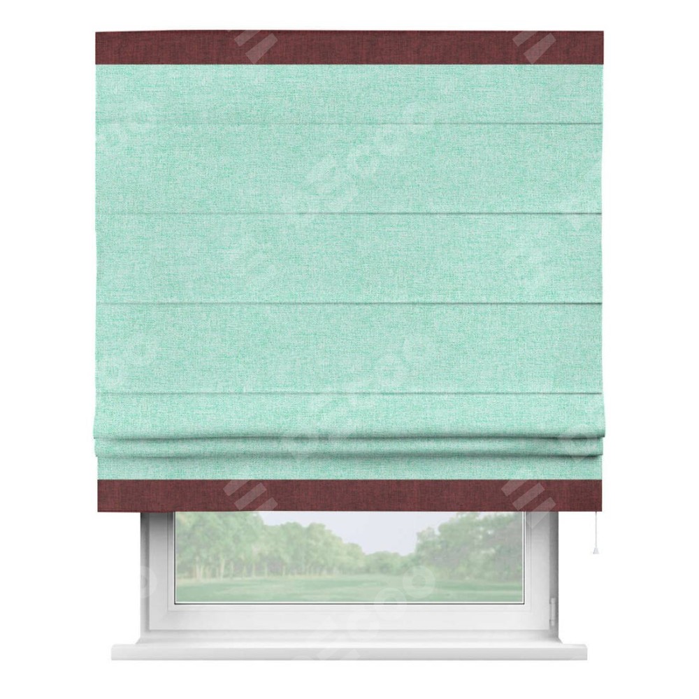 Римская штора пошита из ткани лён кашемир мятный, артикул: 21617, с отделкой кантом «Горизонт» предлагает уникальное дизайнерское решение, при котором кант располагается только вверху и снизу шторы. Такое решение делает акцент на горизонтальных линиях, визуально расширяя пространство и придавая окну более строгий и организованный вид. Отделка кантом в этих ключевых местах не только украшает штору, но и способствует её долговечности, защищая наиболее уязвимые к износу края.
