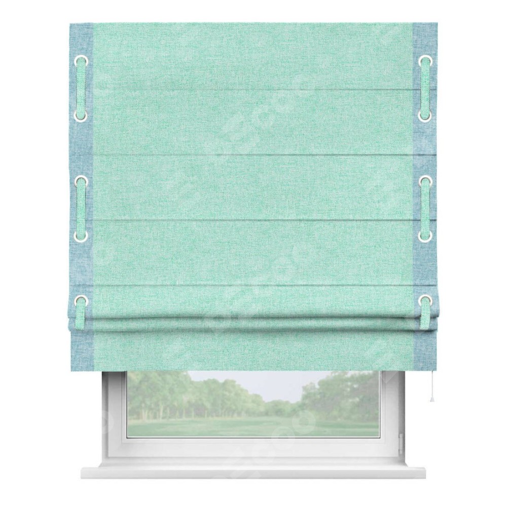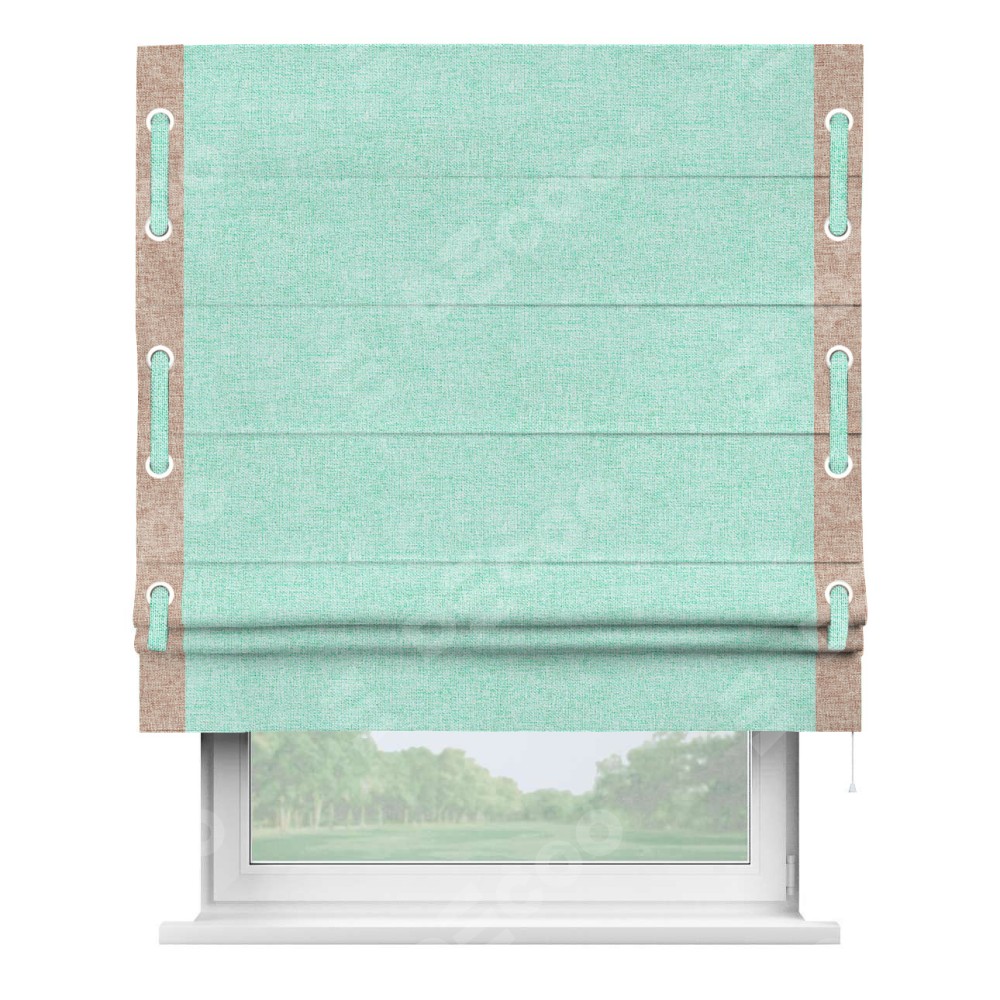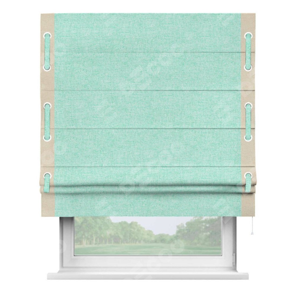 Римская штора «Кортин» для проёма, лён кашемир мятный, с кантом Стрим Дуо (люверсы с пояском)
