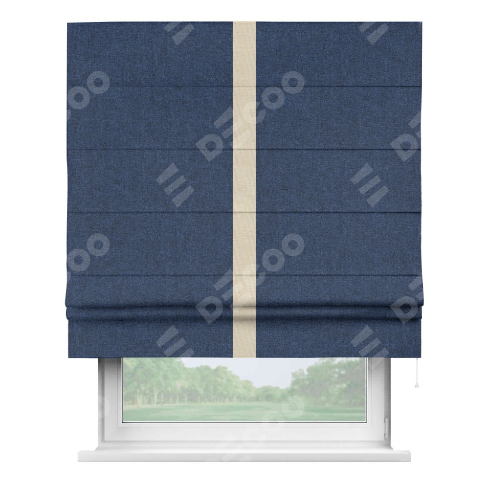 Римская штора пошита из ткани лён кашемир тёмно-синий, артикул: 17215, с отделкой кантом «Хайвэй» представляет собой уникальное и смелое дизайнерское решение, где кант расположен вертикально посередине шторы. Этот дизайн не только выделяет штору среди других вариантов оформления окон, но и создает интересный визуальный акцент, привлекая внимание к центру окна и разделяя штору на визуальные зоны. Такой нестандартный подход добавляет динамичности интерьеру и может быть использован для подчеркивания особенностей оформления помещения.