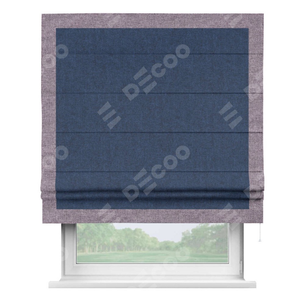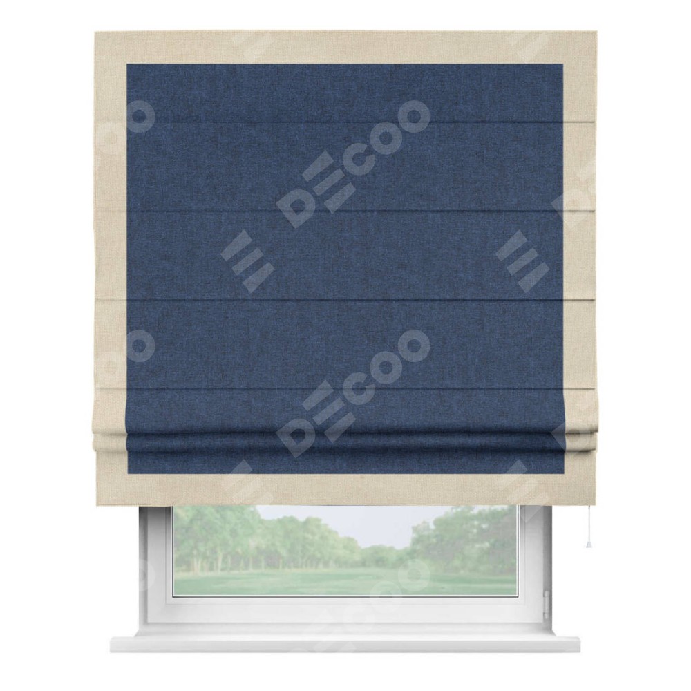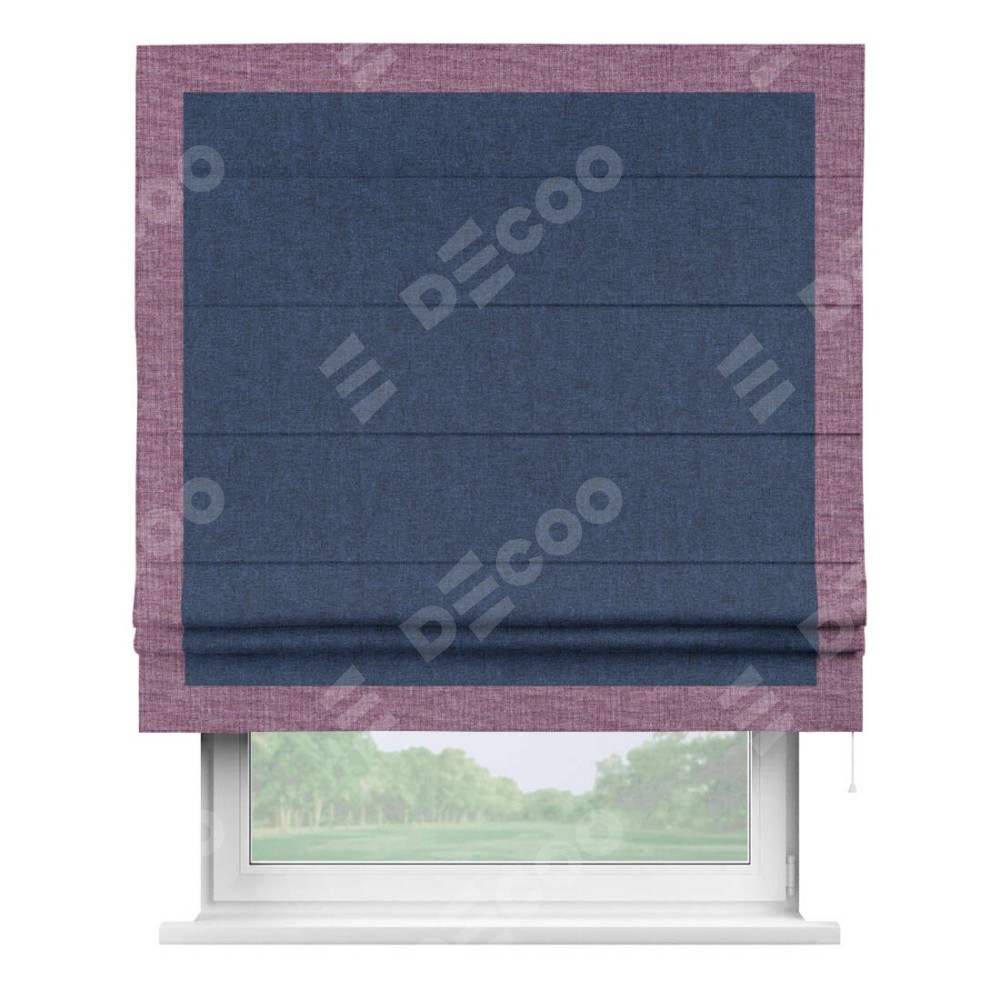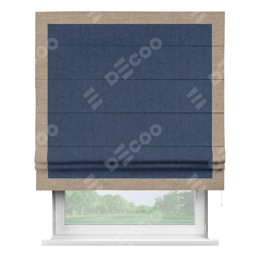 Римская штора пошита из ткани лён кашемир тёмно-синий, артикул: 17215, с отделкой кантом «Чесс» отличается своей уникальной деталью — наличием канта не только по бокам и снизу, но и сверху по всем краям шторы. Это придает шторе особенно аккуратный и завершенный вид, делая акцент на границах и форме шторы. Отделка кантом по всему периметру шторы усиливает её декоративные качества и подчеркивает строгую геометрию, что может быть особенно актуально для современных и минималистичных интерьеров.