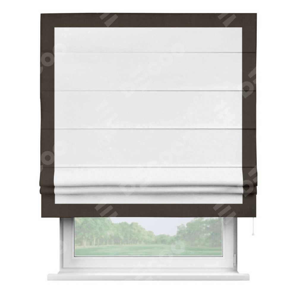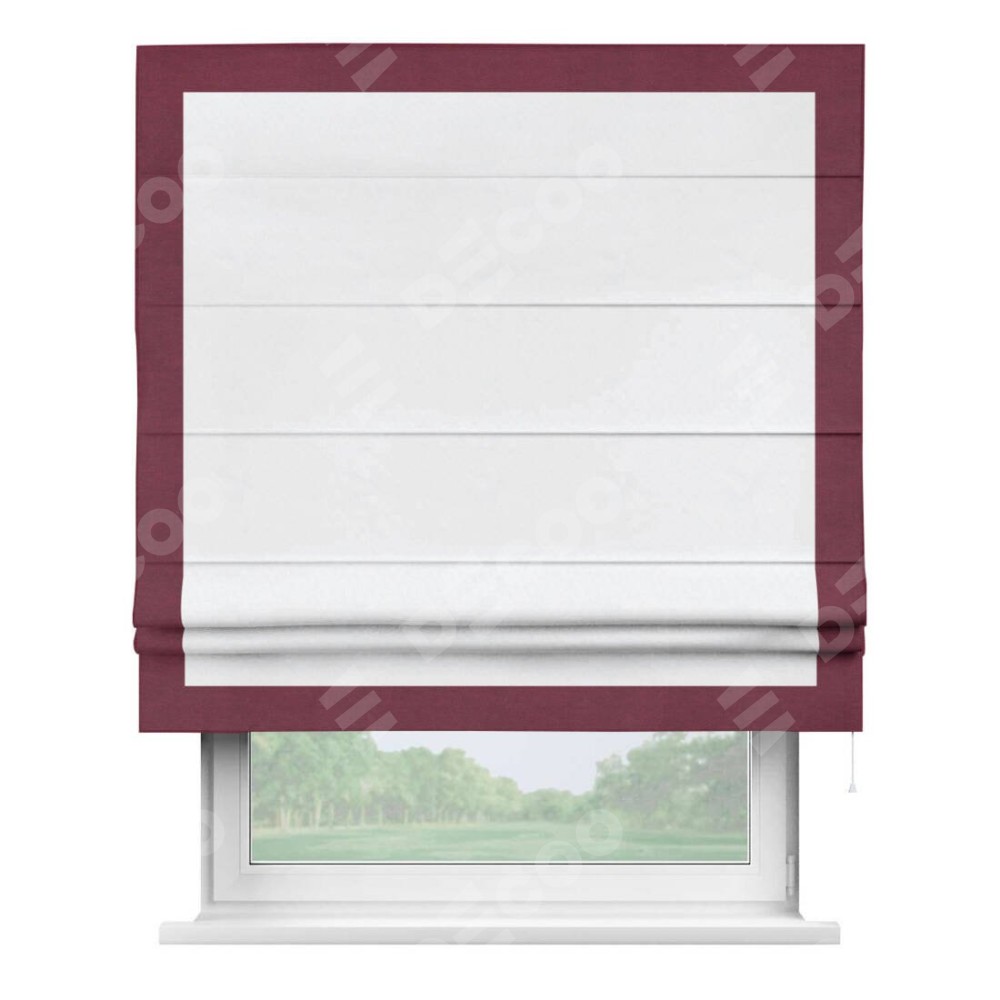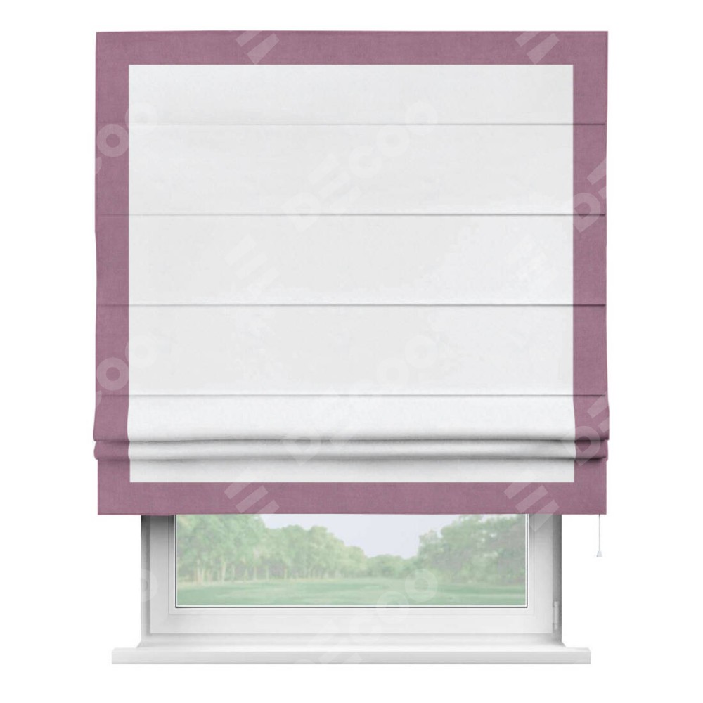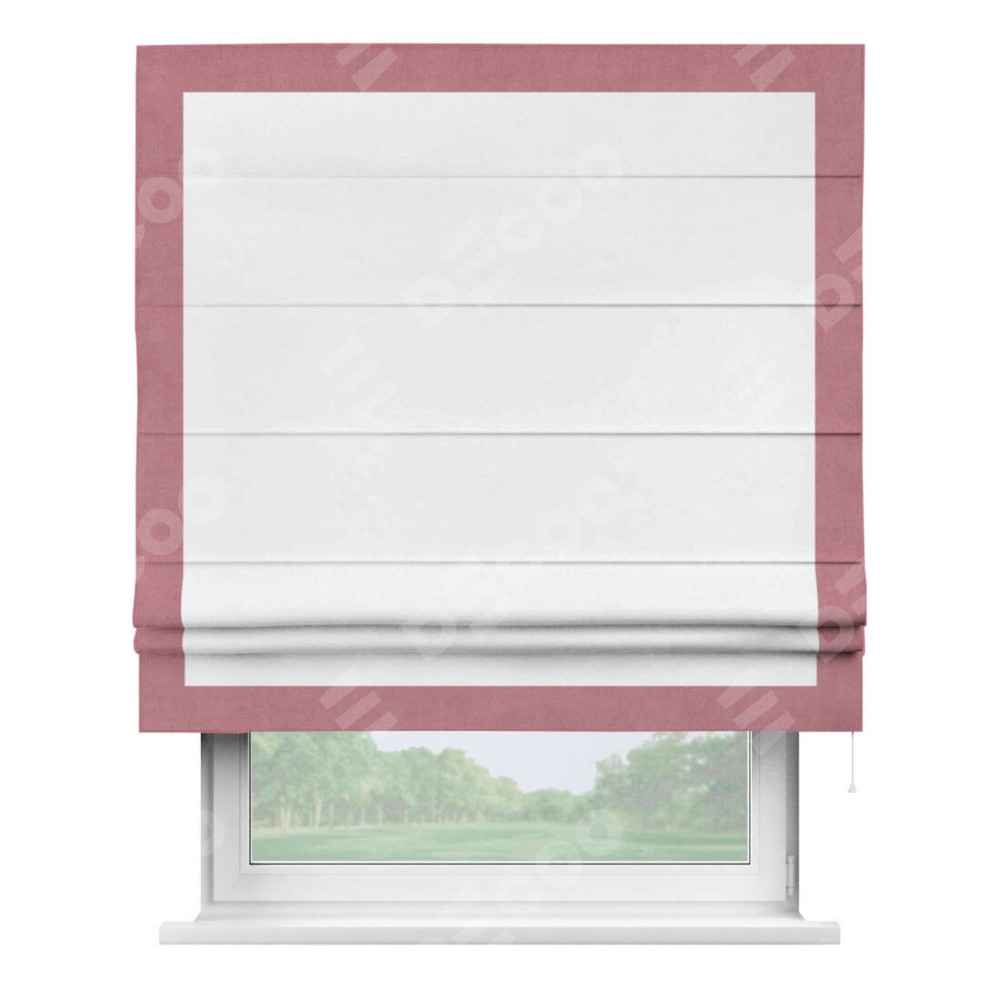 Римская штора пошита из ткани вельвет белоснежный, артикул: 92698, с отделкой кантом «Чесс» отличается своей уникальной деталью — наличием канта не только по бокам и снизу, но и сверху по всем краям шторы. Это придает шторе особенно аккуратный и завершенный вид, делая акцент на границах и форме шторы. Отделка кантом по всему периметру шторы усиливает её декоративные качества и подчеркивает строгую геометрию, что может быть особенно актуально для современных и минималистичных интерьеров.
