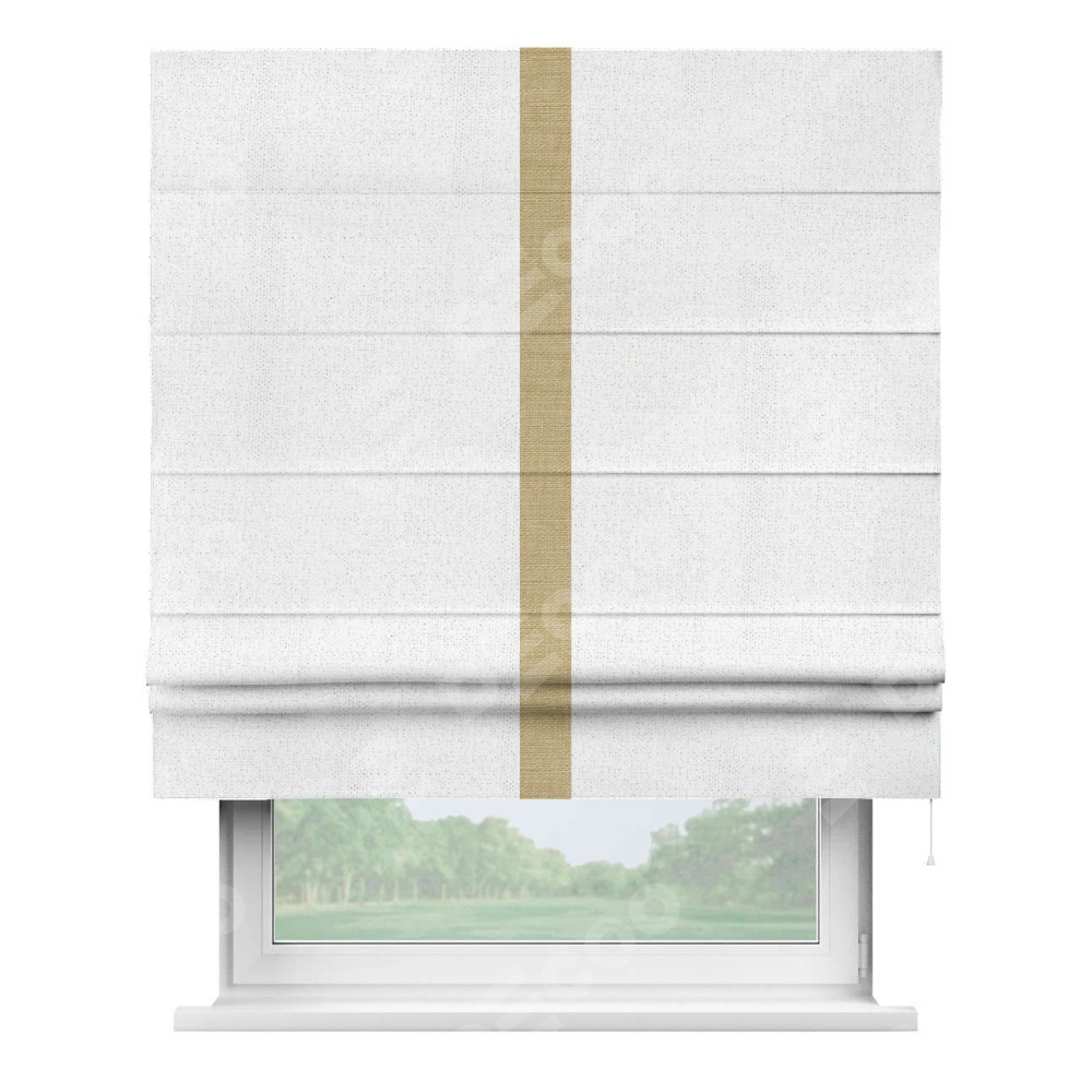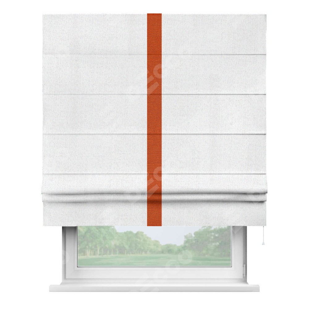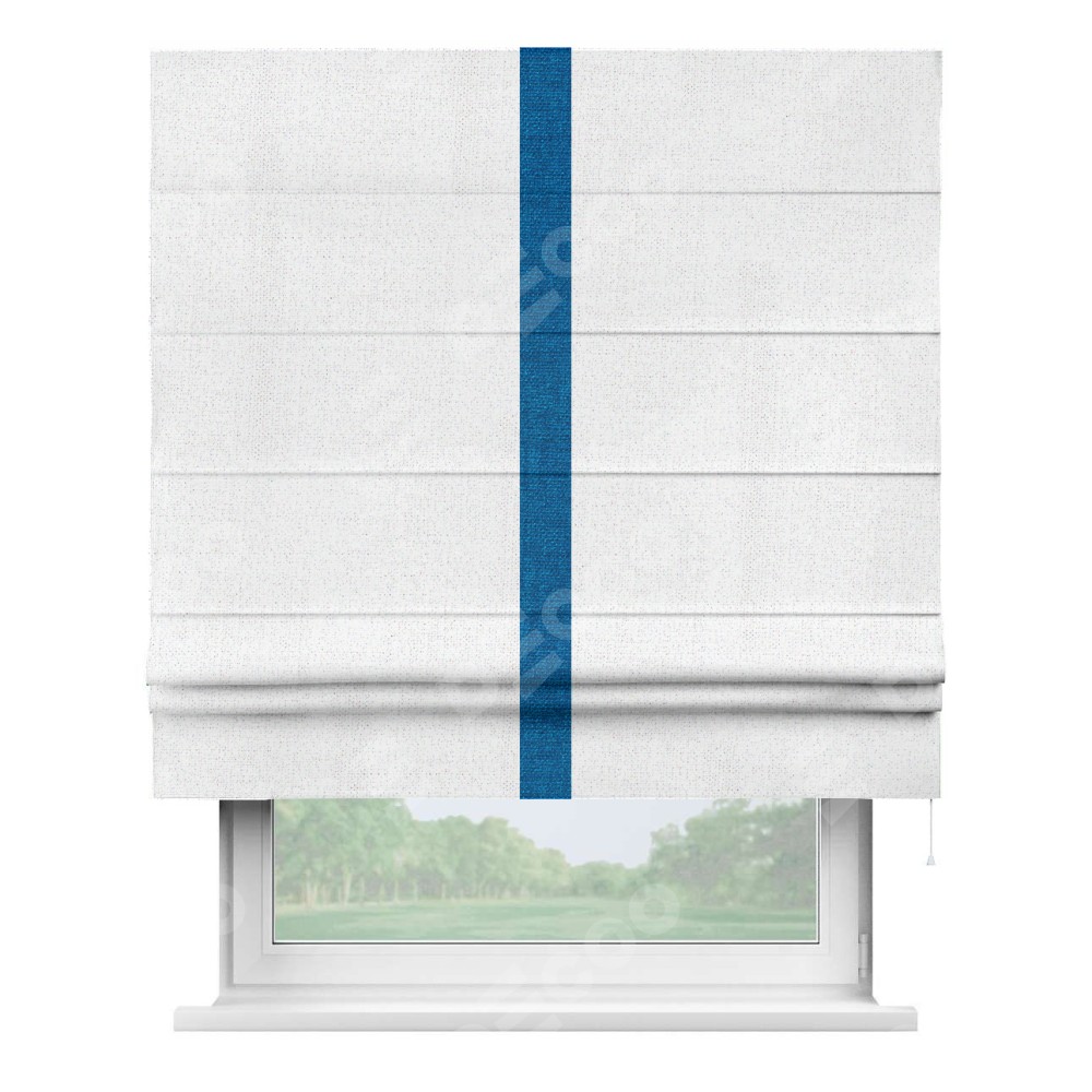 Римская штора пошита из ткани лён белоснежный, артикул: 95632, с отделкой кантом «Хайвэй» представляет собой уникальное и смелое дизайнерское решение, где кант расположен вертикально посередине шторы. Этот дизайн не только выделяет штору среди других вариантов оформления окон, но и создает интересный визуальный акцент, привлекая внимание к центру окна и разделяя штору на визуальные зоны. Такой нестандартный подход добавляет динамичности интерьеру и может быть использован для подчеркивания особенностей оформления помещения.