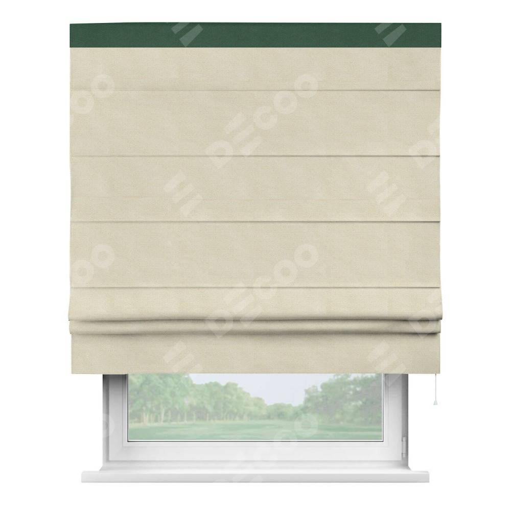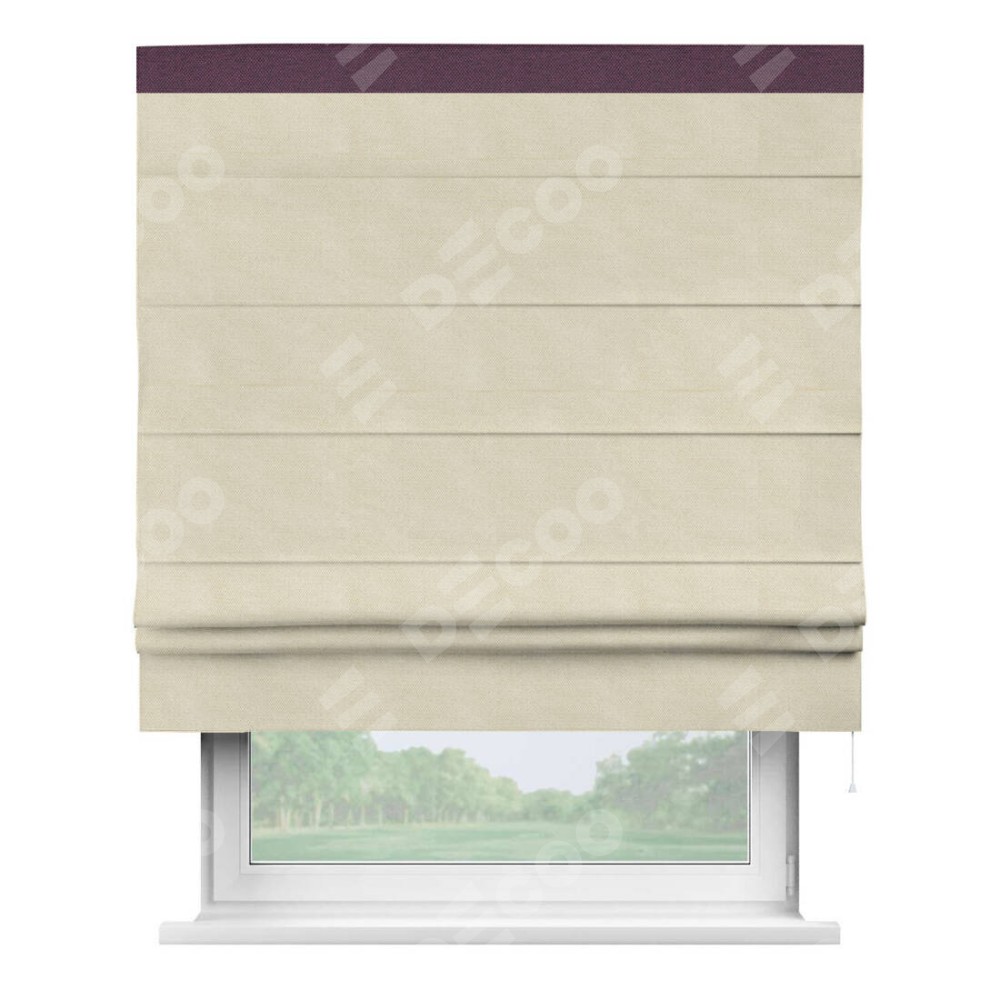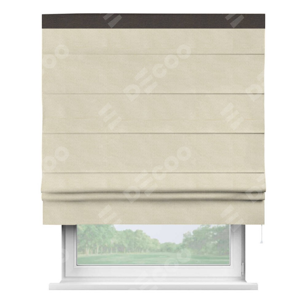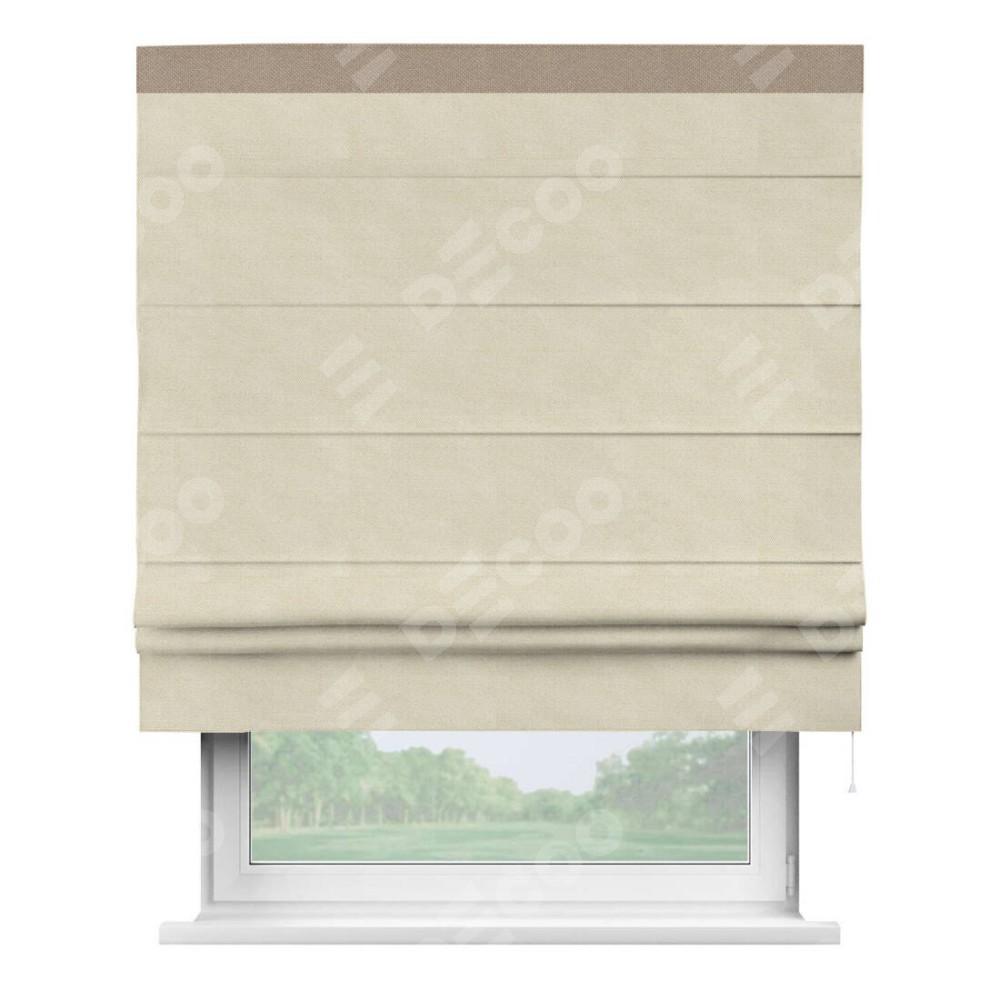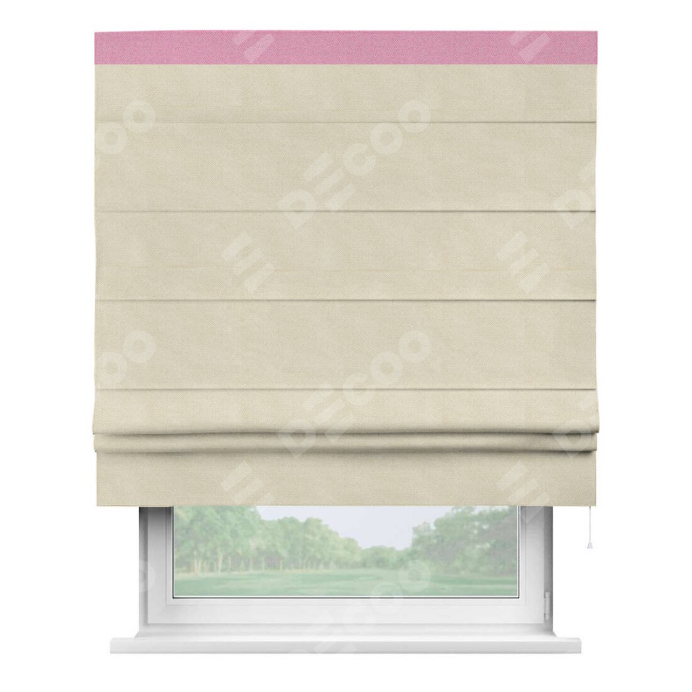Римская штора производителя «Cortin», используется для проёма, пошита из ткани лён димаут бежевый, артикул 83023. Отделка шторы кантом «Кинг», ткань для канта используется из льна димаут разной расцветки на выбор. Имеет универсальный механизм и подходит для монтажа: на потолок, на стену и в нишу.