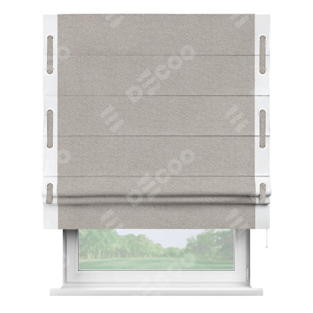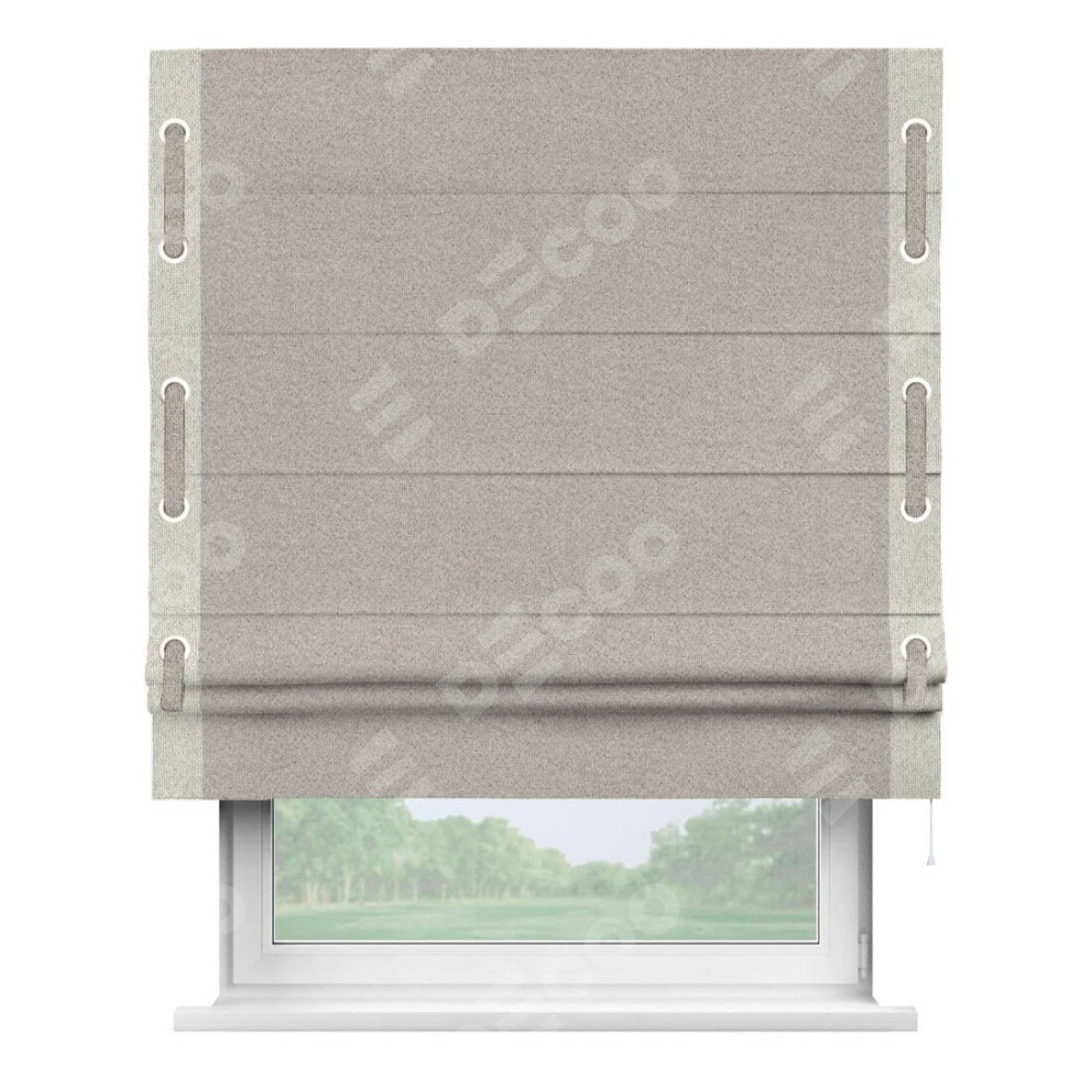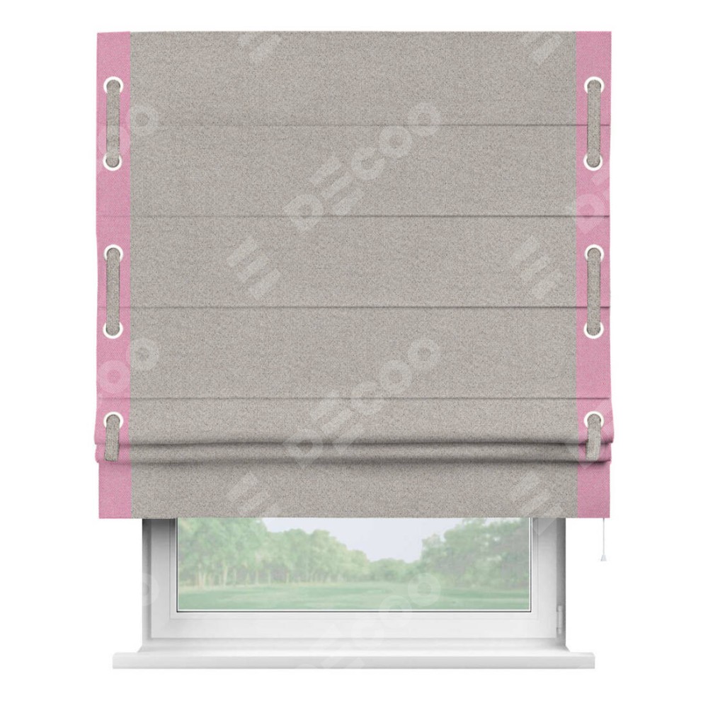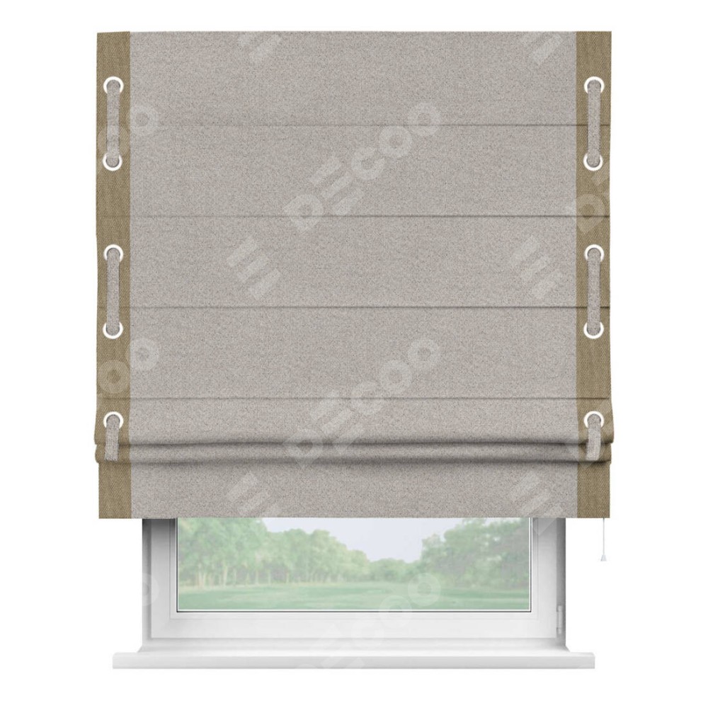 Римская штора «Кортин» для проема, лён димаут серо-бежевый с кантом Стрим Дуо (люверсы с пояском)