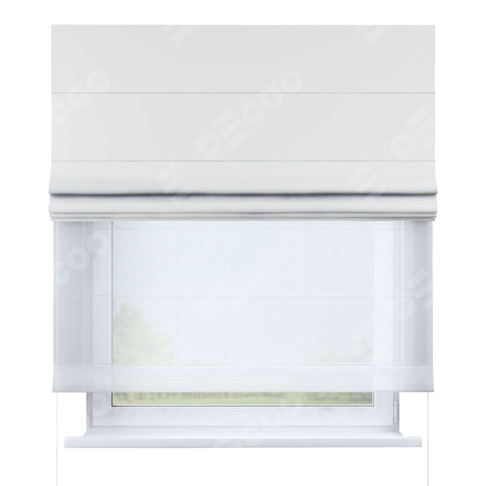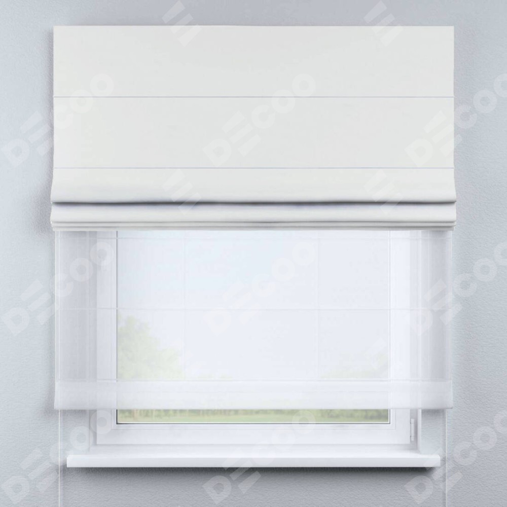 Двойная римская штора «День-ночь» от производителя Cortin предназначена для использования в проёмах. Эта штора уникальна тем, что состоит из двух полотен. На лицевой стороне находится лён димаут молочный (артикул: 29), обеспечивающий эффективное затемнение. В комплект также входит вторая ткань — легкий белый тюль (артикул: V-01), который добавляет изящества и легкости оформлению окна. Кроме того, доступны и другие разновидности ткани тюль, выбор которых доступен по  ссылке .